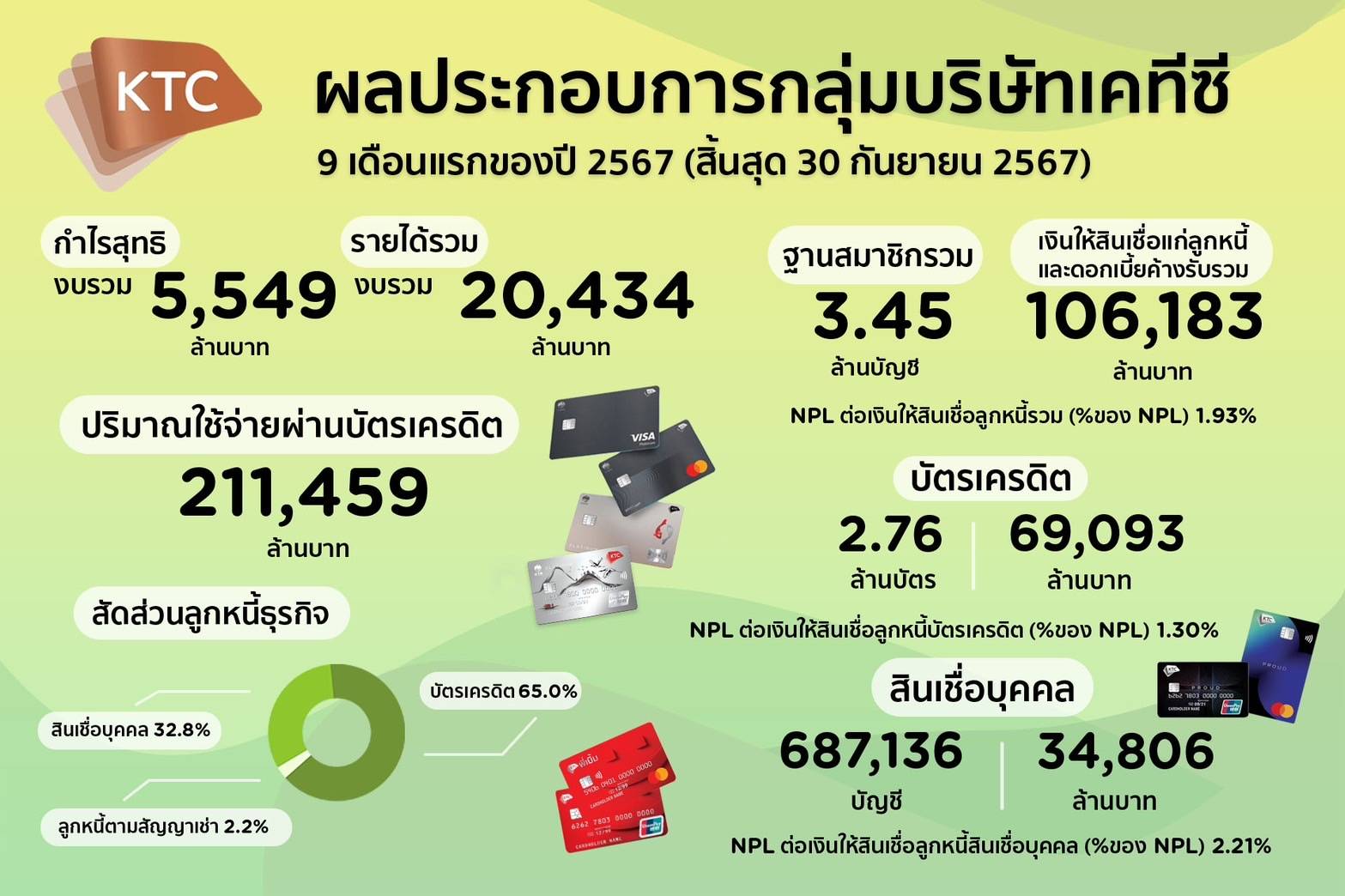 ทั้งนี้ ข้อมูล ณ วันที่ 30 กันยายน 2567 เทียบกับช่วงเดียวกันของปี 2566 เคทีซีมีฐานสมาชิกรวม 3,445,286 บัญชี เงินให้สินเชื่อแก่ลูกหนี้และดอกเบี้ยค้างรับรวม 106,183 ล้านบาท (ลดลง 0.5%) อัตราส่วนสินเชื่อด้อยคุณภาพต่อเงินให้สินเชื่อรวม (NPL) 1.93% แบ่งเป็นสมาชิกบัตรเครดิต 2,758,150 บัตร (เพิ่มขึ้น 5.4%) เงินให้สินเชื่อแก่ลูกหนี้บัตรเครดิตและดอกเบี้ยค้างรับรวม 69,093 ล้านบาท (ลดลง 0.2%) NPL บัตรเครดิตอยู่ที่ 1.30% ปริมาณการใช้จ่ายผ่านบัตร 9 เดือนของปี 2567 เท่ากับ 211,459 ล้านบาท (เพิ่มขึ้น 10.0%) สมาชิกสินเชื่อบุคคลเคทีซี 687,136 บัญชี (ลดลง 3.9%) เงินให้สินเชื่อแก่ลูกหนี้สินเชื่อบุคคลและดอกเบี้ยค้างรับรวม 34,806 ล้านบาท (เพิ่มขึ้น 2.1%) NPL สินเชื่อบุคคลอยู่ที่ 2.21% โดยเป็นยอดสินเชื่อ “เคทีซี พี่เบิ้ม รถแลกเงิน” จำนวน 2,959 ล้านบาท ในส่วนของลูกหนี้ตามสัญญาเช่าในบริษัท กรุงไทยธุรกิจลีสซิ่ง จำกัด (KTBL) มีมูลค่า 2,284 ล้านบาท (ลดลง 32.2%) ซึ่งเคทีซีได้หยุดปล่อยสินเชื่อประเภทนี้ตั้งแต่เดือนสิงหาคม 2566 และปัจจุบันมุ่งเน้นการติดตามหนี้และบริหารจัดการคุณภาพพอร์ตสินเชื่อที่มีอยู่