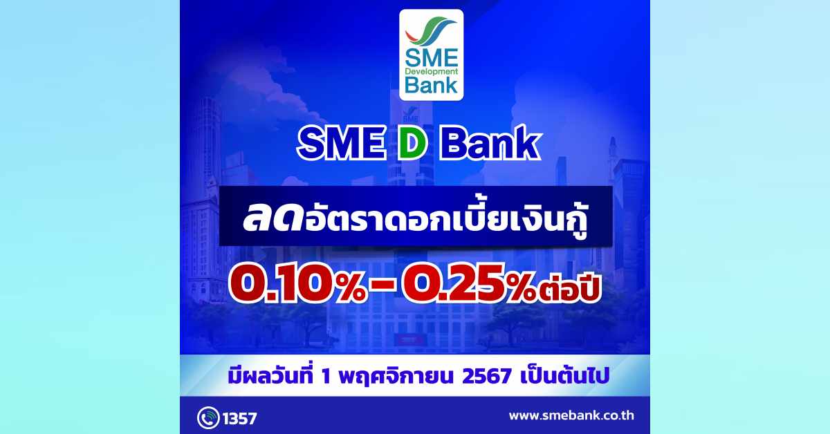 นายพิชิต มิทราวงศ์ กรรมการผู้จัดการ ธนาคารพัฒนาวิสาหกิจขนาดกลางและขนาดย่อมแห่งประเทศไทย (ธพว.) หรือ SME D Bank กล่าวว่า SME D Bank ปรับลดอัตราดอกเบี้ยเงินกู้ลงสูงสุด 0.25% ต่อปี ประกอบด้วย ประเภทเงินกู้ยืมสำหรับลูกค้ารายย่อยชั้นดี (Minimum Retail Rate : MRR) ลด 0.25% ต่อปี จาก 8.05% ต่อปี เหลือ 7.80% ต่อปี, ประเภทเงินเบิกเกินบัญชี (Minimum Overdraft Rate : MOR) ลด 0.25% ต่อปี จาก 8.05% ต่อปี เหลือ 7.80% ต่อปี และประเภทเงินกู้ขั้นต่ำ (Minimum Laon Rate : MLR) ลด 0.10% จาก 7.50% ต่อปี เหลือ 7.40% ต่อปี มีผลตั้งแต่วันที่ 1 พฤศจิกายน 2567 เป็นต้นไป เพื่อช่วยลดภาระให้แก่ผู้ประกอบการเอสเอ็มอีไทย รวมถึงช่วยกระตุ้นการขับเคลื่อนเศรษฐกิจในประเทศ อีกทั้งสอดคล้องกับนโยบายรัฐบาล และธนาคารแห่งประเทศไทย (ธปท.) โดยคณะกรรมการนโยบายการเงิน (กนง.) ที่มีมติเมื่อวันที่ 16 ตุลาคม 2567 ที่ผ่านมา ปรับลดอัตราดอกเบี้ยนโยบาย จาก 2.50% ต่อปี เหลือ 2.25% ต่อปี เพื่อช่วยบรรเทาภาระหนี้ให้กับประชาชน และภาคธุรกิจ
