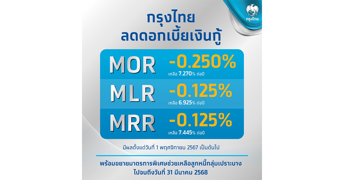 กรุงเทพฯ 22 ต.ค.- ธ.กรุงไทย ประกาศลดอัตราดอกเบี้ยเงินกู้ MOR MLR และ MRR เริ่ม 1 พ.ย. พร้อมต่ออายุมาตรการช่วยเหลือกลุ่มเปราะบาง