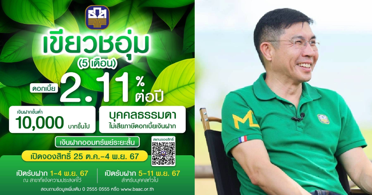 นายฉัตรชัย ศิริไล ผู้จัดการธนาคารเพื่อการเกษตรและสหกรณ์การเกษตร (ธ.ก.ส.) กล่าวว่า เพื่อเป็นการส่งเสริมการออมให้แก่ประชาชนและพี่น้องเกษตรกร ในโอกาสครบรอบวันสถาปนา ธ.ก.ส. ปีที่ 59 ในวันที่ 1 พฤศจิกายน 2567 ธ.ก.ส. จึงได้จัดทำผลิตภัณฑ์ “เงินฝากเขียวชอุ่ม” โครงการเงินฝากออมทรัพย์พิเศษระยะสั้น รับฝากรวม 10,000 ล้านบาท ที่ให้ผลตอบแทนเป็นอัตราดอกเบี้ยสูงถึงร้อยละ 2.11 ต่อปี ระยะเวลาฝาก 5 เดือน (นับจากวันรับฝากแบบวันชนวัน) ฝากขั้นต่ำครั้งละ 10,000 บาท สูงสุดไม่เกิน 100 ล้านบาทต่อบัญชี โดยบุคคลธรรมดาไม่เสียภาษีจากดอกเบี้ยเงินฝากเขียวชอุ่ม และกรณีผู้ฝากถอนเงินบางส่วนหรือปิดบัญชีก่อนกำหนด ธนาคารจะจ่ายดอกเบี้ยตามเงื่อนไขที่ธนาคารกำหนด
