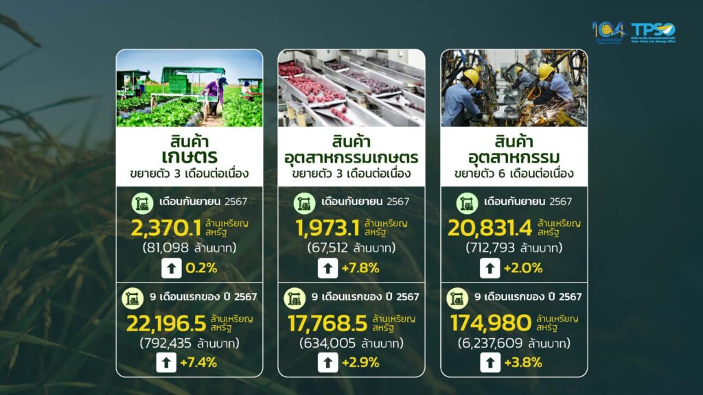 นายพูนพงษ์ นัยนาภากรณ์ ผู้อำนวยการสำนักงานนโยบายและยุทธศาสตร์การค้า กระทรวงพาณิชย์ เปิดเผยว่า การส่งออกเดือนกันยายน 2567 มูลค่า 25,983 ล้านเหรียญสหรัฐ (889,074 ล้านบาท) ขยายตัวร้อยละ 1.1 ขยายตัวต่อเนื่องเป็นเดือนที่ 3 เนื่องจากเศรษฐกิจในตลาดหลักอย่างสหรัฐ และสหภาพยุโรป เริ่มฟื้นตัวจากสถานการณ์เงินเฟ้อคลี่คลายลง ภาวะการค้าในเดือนกันยายน 2567 เกินดุลการค้า 394.2 ล้านเหรียญสหรัฐ ทำให้ภาวะการค้าการส่งออกไทย 9 เดือนแรกของปี 67 ขยายตัวร้อยละ 3.9 และเมื่อหักสินค้า น้ำมัน ทองคำ และยุทธปัจจัย ขยายตัวร้อยละ 4.2 โดยส่งออก มีมูลค่า 223,176 ล้านเหรียญสหรัฐ ขยายตัวร้อยละ 3.9 เทียบกับช่วงเดียวกันของปีก่อน การนำเข้า มีมูลค่า 229,132 ล้านเหรียญสหรัฐ ขยายตัวร้อยละ 5.5 ดุลการค้า 9 เดือนแรก ขาดดุล 5,956 ล้านเหรียญสหรัฐ ยอมรับว่าตลาดอาเซียนหดตัวร้อยละ 6.7 (นับว่าหดตัวในรอบ 3 เดือน) สินค้าสำคัญที่หดตัว เช่น รถยนต์ อุปกรณ์และส่วนประกอบ น้ำมันสำเร็จรูป และเครื่องคอมพิวเตอร์ ทำให้ 9 เดือนแรกของปี 2567 หดตัวร้อยละ 0.3