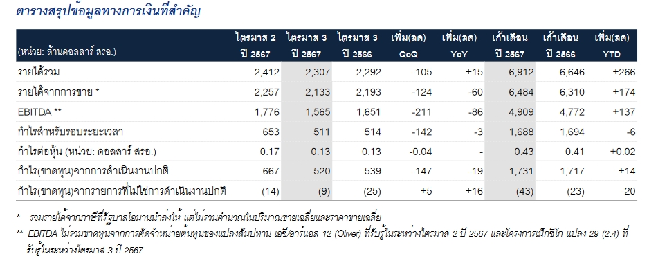 สำหรับผลประกอบการไตรมาส 3 ปี 2567 กำไรสุทธิ 511 ล้านดอลลาร์ สรอ. ลดลงร้อยละ 1 เมื่อเปรียบเทียบกับไตรมาส 3 ปี 2566 และ ลดลง 142 ล้านดอลลาร์ สรอ. คิดเป็นร้อยละ 22 เมื่อเปรียบเทียบกับไตรมาส 2 ปี 2567 ที่มีกำไรสุทธิ 653 ล้านดอลลาร์ สรอ. โดยหลักจากปริมาณขายเฉลี่ยต่อวันปรับตัวลดลงร้อยละ 6 จากไตรมาสก่อนหน้า มาอยู่ที่ 475,078 บาร์เรลเทียบเท่าน้ำมันดิบต่อวัน เนื่องจาก การปิดซ่อมบำรุงประจำปีของโครงการจี 2/61 โครงการอาทิตย์ โครงการคอนแทร็ค 4 และโครงการจี 1/61 สุทธิกับโครงการมาเลเซีย แปลง เค ที่มีการขาย น้ำมันดิบเพิ่มขึ้น ขณะที่ราคาขายเฉลี่ยของบริษัทปรับเพิ่มขึ้นร้อยละ 0.1 มาอยู่ที่ 47.07 ดอลลาร์ สรอ. ต่อบาร์เรลเทียบเท่าน้ำมันดิบ จากราคาขายก๊าซธรรมชาติที่เพิ่มขึ้น ในขณะที่ ต้นทุนต่อหน่วยของบริษัทอยู่ที่ 31.91 ดอลลาร์ สรอ. ต่อบาร์เรลเทียบเท่าน้ำมันดิบ -511 .-สำนักข่าวไทย