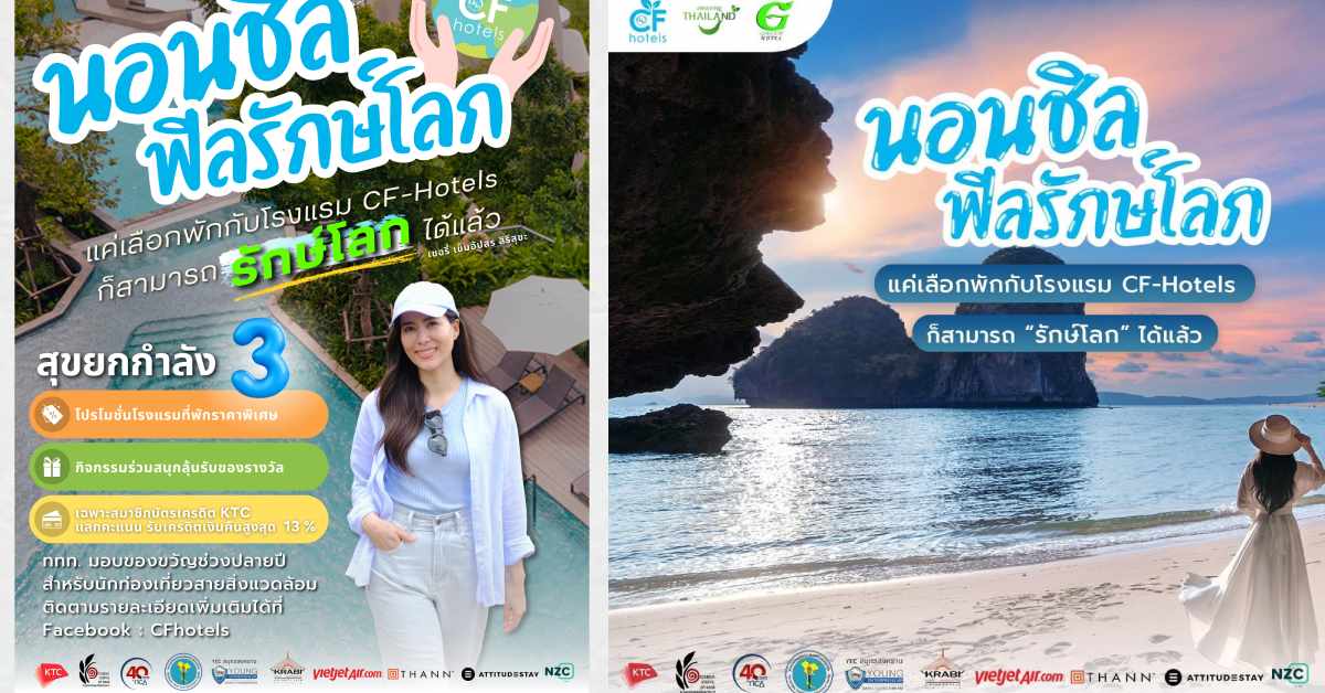 นางจิระวดี คุณทรัพย์ รองผู้ว่าการด้านสินค้าและธุรกิจท่องเที่ยว การท่องเที่ยวแห่งประเทศไทย (ททท.) กล่าวว่า แคมเปญ “CF-Hotels นอนชิลฟีลรักษ์โลก” เป็นหนึ่งในกิจกรรมส่งเสริมการตลาดของ ททท.เพื่อสร้างการรับรู้และสร้างกระแสให้แก่กลุ่มนักท่องเที่ยวได้หันมาปรับพฤติกรรมช่วยกันใส่ใจสิ่งแวดล้อม กระตุ้นให้เกิดความต้องการเดินทางท่องเที่ยวที่โรงแรม ที่พักที่เป็นมิตรต่อสิ่งแวดล้อม CF-Hotels มากขึ้น ด้วยการมอบประสบการณ์สุดพิเศษให้แก่กลุ่มนักท่องเที่ยว ด้วยโปรโมชั่น “สุขยกกำลัง 3” ได้แก่ โปรโมชั่นโรงแรมที่พักราคาสุดพิเศษจากโรงแรมรักษ์โลก CF-Hotels กิจกรรมร่วมสนุกทางเพจ Facebook : CF-Hotels ลุ้นรับรางวัลพิเศษ อาทิ ที่พักฟรี จากโรงแรม CF-Hotels ที่เข้าร่วมโครงการ, ลุ้นรับตั๋วเครื่องบินฟรีที่เพจสายการบิน Vietjet Air และนักท่องเที่ยวที่เป็นมิตรกับสิ่งแวดล้อม ทำการจองโรงแรม CF-Hotels จำนวน 10 คนแรก ของแต่ละโรงแรม รับฟรี ผลิตภัณฑ์จาก THANN ขณะที่สมาชิกบัตรเครดิต KTC สามารถแลกคะแนนรับเครดิตเงินคืนสูงสุด 13% และสิทธิพิเศษอื่น ๆ จากโรงแรมที่ร่วมรายการ ตั้งแต่บัดนี้ – 31 ธันวาคม 2567
