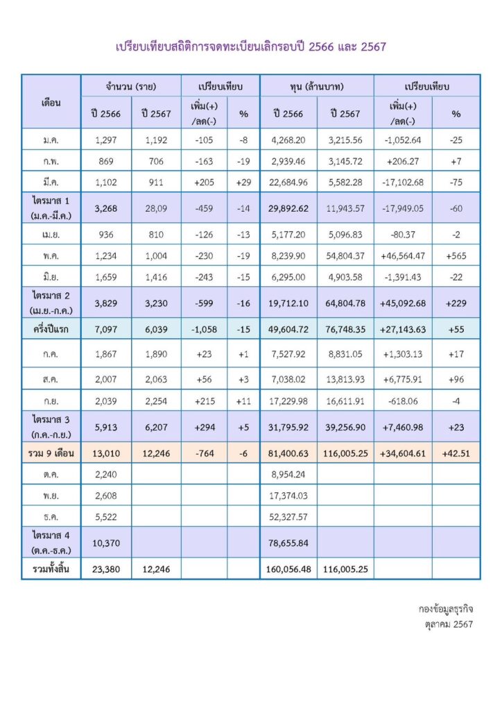 ทั้งนี้ เดือนกันยายน 2567 มีนิติบุคคลที่มีทุนจดทะเบียนเลิกประกอบกิจการเกิน 1,000 ล้านบาท จำนวน 2 ราย คือ 1) บจ.เซ็นทรัล เจดี คอมเมิร์ซ จำกัด (แพลตฟอร์ม JD CENTRAL) ทุนจดทะเบียนเลิก 4,959.27 ล้านบาท ประกอบกิจการค้าปลีกผ่านช่องทางอิเล็กทรอนิกส์ 2) บจ.เซ็นทรัล เจดี มันนี่ จำกัด (แพลตฟอร์ม Dolfin Wallet) ทุนจดทะเบียนเลิก 2,532.00 ล้านบาท ประกอบกิจการให้บริการเงินอิเล็กทรอนิกส์เพื่อใช้ชำระค่าสินค้าหรือบริการ