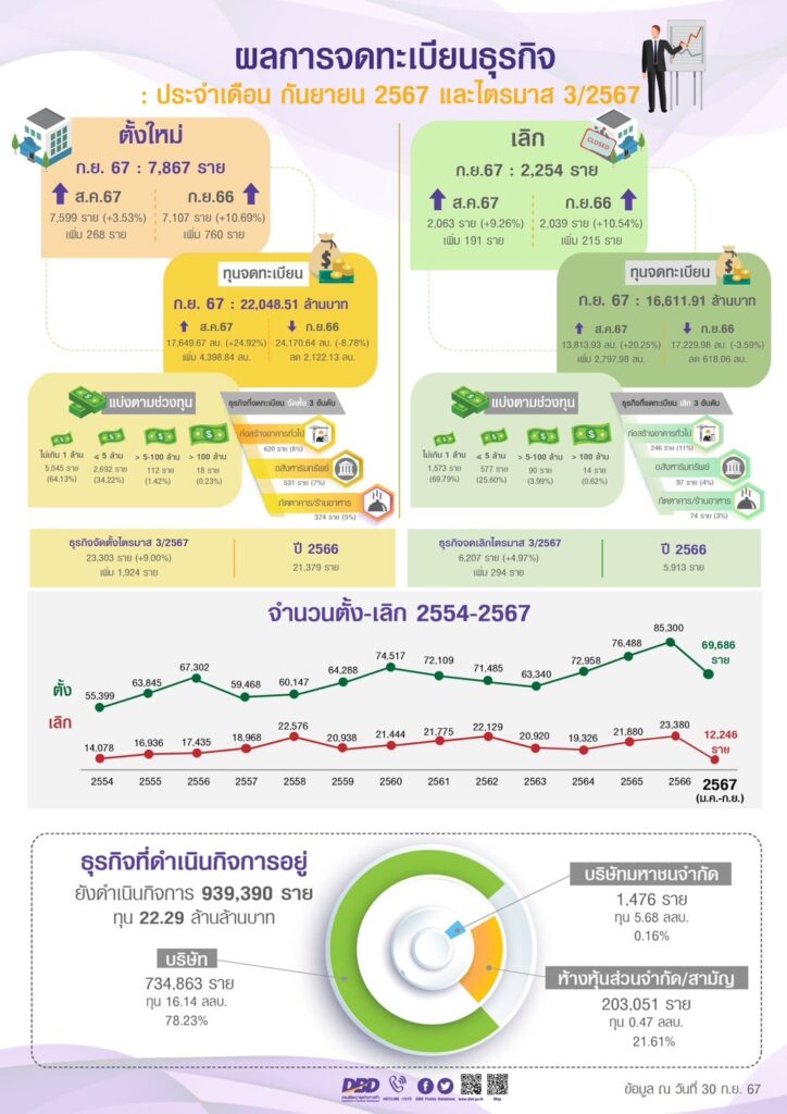 นางอรมน ทรัพย์ทวีธรรม อธิบดีกรมพัฒนาธุรกิจการค้า กระทรวงพาณิชย์ เปิดเผยว่า เดือนกันยายน 2567 มีการจดทะเบียนจัดตั้งธุรกิจใหม่จำนวน 7,867 ราย เมื่อเทียบกับช่วงเดียวกันของปีที่แล้วพบว่าเพิ่มขึ้น 760 ราย (10.69%) และทุนจดทะเบียน 22,048.51 ล้านบาท ลดลง 2,122.13 ล้านบาท (8.78%) โดยเดือนกันยายน 2567 มีนิติบุคคลที่มีทุนจดทะเบียนจัดตั้งเกิน 1,000 ล้านบาท จำนวน 1 ราย คือ บริษัท แกรนด์ เรสซิเดนซ์ อินเตอร์เนชั่นแนล จำกัด มูลค่าทุนจดทะเบียน 1,520.00 ล้านบาท ประกอบกิจการซื้อ จัดหา รับ เช่า เช่าซื้อ ให้เช่า ถือกรรมสิทธิ์ครอบครอง ปรับปรุง ใช้ และจัดการ โดยประการอื่นซึ่งทรัพย์สินใดๆ ตลอดจน ดอกผลของทรัพย์สินนั้น ประเภทธุรกิจที่มีการจัดตั้งใหม่สูงสุด 3 อันดับแรก ได้แก่ 1) ธุรกิจก่อสร้างอาคารทั่วไป 620 ราย ทุน 1,349.33 ล้านบาท 2) ธุรกิจอสังหาริมทรัพย์ 531 ราย ทุน 3,465.99 ล้านบาท และ 3) ธุรกิจภัตตาคาร/ร้านอาหาร 374 ราย ทุนจดทะเบียน 716.75 ล้านบาท คิดเป็นสัดส่วน 7.88% 6.75% และ 4.75% จากจำนวนการจัดตั้งธุรกิจในเดือนกันยายน 2567 ตามลำดับ