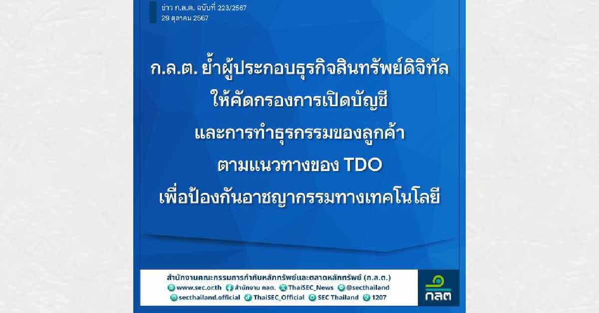 เมื่อวันที่ 21 กุมภาพันธ์ 2567 ก.ล.ต. ได้ประสานงานกับ TDO และกองบังคับการปราบปรามการกระทำความผิดเกี่ยวกับอาชญากรรมทางเศรษฐกิจ (บก.ปอศ.) เกี่ยวกับการแก้ไขปัญหาอาชญากรรมทางเทคโนโลยี โดยมีการจัดงานสัมมนาเชิงปฏิบัติการ (workshop) เพื่อแลกเปลี่ยนข้อมูลระหว่างผู้ประกอบธุรกิจสินทรัพย์ดิจิทัล และเมื่อวันที่ 7 พฤษภาคม 2567 TDO ได้ออกแนวทางปฏิบัติงาน เรื่อง การพิจารณาบัญชีต้องสงสัยว่าถูกใช้ในการกระทำความผิด เพื่อให้ผู้ประกอบธุรกิจที่เป็นสมาชิกของ TDO ใช้เป็นแนวทางปฏิบัติงานในการเฝ้าระวังลูกค้าและธุรกรรมที่อาจเกี่ยวข้องกับอาชญากรรมทางเทคโนโลยี เนื่องจากการทำความรู้จักตัวตน (KYC) ของลูกค้าและการตรวจสอบธุรกรรมที่ต้องสงสัยของลูกค้าเป็นมาตรการสำคัญที่จะช่วยในการป้องกันไม่ให้กลุ่มมิจฉาชีพสามารถทำธุรกรรมซื้อขายสินทรัพย์ดิจิทัล และใช้สินทรัพย์ดิจิทัลเป็นช่องทางถ่ายเททรัพย์สินจากการกระทำความผิด เมื่อวันที่ 18 ตุลาคม 2567 ก.ล.ต.จึงได้ออกหนังสือเวียนไปยังผู้ประกอบธุรกิจศูนย์ซื้อขายสินทรัพย์ดิจิทัล นายหน้าซื้อขายสินทรัพย์ดิจิทัล และผู้ค้าสินทรัพย์ดิจิทัล เพื่อให้ดำเนินการปรับใช้แนวทางปฏิบัติงานของ TDO เรื่อง การพิจารณาบัญชีต้องสงสัยว่าถูกใช้ในการกระทำความผิด เพื่อเป็นการสนับสนุนและบูรณาการการดำเนินการป้องกันและปราบปรามอาชญากรรมทางเทคโนโลยี รวมทั้งสร้างความน่าเชื่อถือให้แก่อุตสาหกรรมสินทรัพย์ดิจิทัลในประเทศไทย