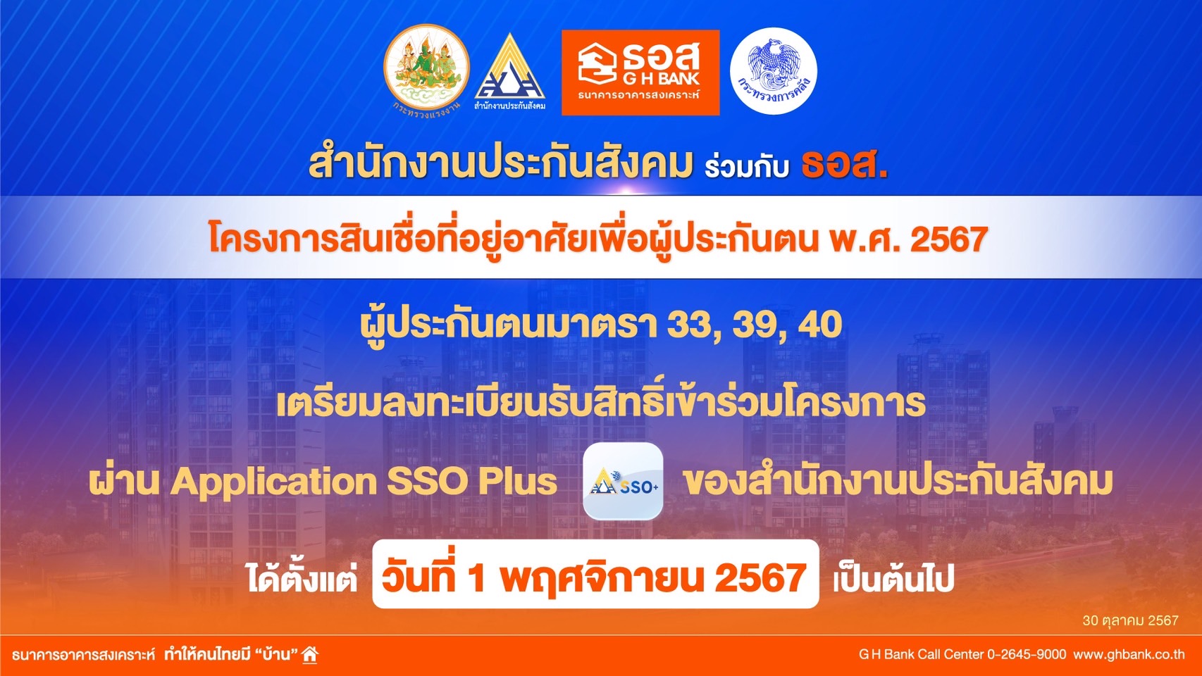 กรุงเทพฯ 30 ต.ค. – ธอส.ดีเดย์ 1 พ.ย.ช่วยผู้ประกันตนมาตรา 33, 39 หรือ 40 แนะลงทะเบียนรับสิทธิ์เข้าร่วมโครงการ ก่อนเปิดให้ยื่นขอสินเชื่อวันแรกวันที่ 8 พฤศจิกายนนี้