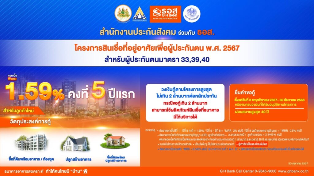 สำนักงานประกันสังคม (สปส.) ร่วมกับธนาคารอาคารสงเคราะห์ (ธอส.) จัดทำ “โครงการสินเชื่อที่อยู่อาศัยเพื่อผู้ประกันตน พ.ศ. 2567” ให้กับผู้ประกันตนตามมาตรา 33, 39 หรือ 40 โดยผู้ประกันตนมาตรา 40 จะต้องส่งเงินสมทบต่อเนื่องไม่น้อยกว่า 1 ปี ก่อนเดือนที่ขอใช้สิทธิ์ โดยปล่อยสินเชื่ออัตราดอกเบี้ยต่ำ 5 ปีแรก เพียง 1.59% ต่อปี วงเงินกู้ตามโครงการสูงสุดไม่เกิน 2 ล้านบาท สำหรับวงเงินกู้ส่วนที่เกิน 2 ล้านบาท สามารถใช้ผลิตภัณฑ์สินเชื่ออื่นของธนาคารได้ ทั้งนี้ ผู้ประกันตนที่เข้าร่วมโครงการ และผู้ขอกู้ร่วมทุกคน ต้องไม่อยู่ระหว่างผ่อนชำระสินเชื่อที่อยู่อาศัยในปัจจุบัน โดยผู้ประกันตนที่สนใจเข้าร่วมโครงการดังกล่าว สามารถลงทะเบียนกับสำนักงานประกันสังคม ผ่านทาง Application SSO Plus เพื่อขอหนังสือรับรองสถานะความเป็นผู้ประกันตน และรับสิทธิ์เข้าร่วมโครงการ ได้ตั้งแต่ วันที่ 1 พฤศจิกายน 2567 เป็นต้นไป พร้อมนำเอกสารส่วนตัว เอกสารแสดงรายได้ และเอกสารหลักประกัน มายื่นขอสินเชื่อได้ที่ ธอส. ทุกสาขาทั่วประเทศ ได้ตั้งแต่วันที่ 8 พฤศจิกายน 2567 เป็นต้นไป