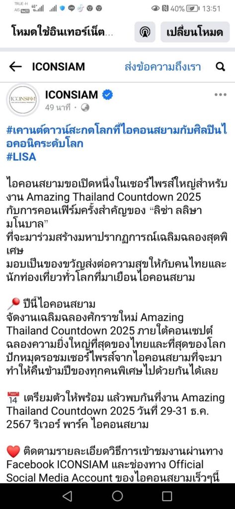 เพจเฟซบุ๊กไอคอนสยาม ระบุไอคอนสยามขอเปิดหนึ่งในเซอร์ไพรส์ใหญ่สำหรับงาน Amazing Thailand Countdown 2025 กับการคอนเฟิร์มครั้งสำคัญของ “ลิซ่า ลลิษา มโนบาล” ที่จะมาร่วมสร้างมหาปรากฏการณ์เฉลิมฉลองสุดพิเศษ มอบเป็นของขวัญส่งต่อความสุขให้กับคนไทยและนักท่องเที่ยวทั่วโลกที่มาเยือนไอคอนสยาม ปีนี้ไอคอนสยาม จัดงานเฉลิมฉลองศักราชใหม่ Amazing Thailand Countdown 2025 ภายใต้คอนเซปต์ ฉลองความยิ่งใหญ่ที่สุดของไทยและที่สุดของโลก ปักหมุดรอชมเซอร์ไพรส์จากไอคอนสยามที่จะมาทำให้คืนข้ามปีของทุกคนพิเศษไปด้วยกัน