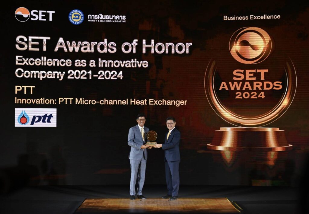 สำหรับรางวัลเกียรติยศแห่งความสำเร็จด้านนวัตกรรม (SET Awards of Honor) ปตท. ได้รับจากการคว้ารางวัล Best Innovative Company Awards 4 ปีติดต่อกัน ได้แก่ ปี 2021 ได้รับรางวัลจากผลงานการพัฒนานวัตกรรมวัสดุปิดแผลไบโอเซลลูโลสคอมพอสิต Innaqua ปี 2022 ได้รับจากนวัตกรรม PTT EV Charger and Charging Platform ปี 2023 ได้รับจากผลงานตัวเร่งปฏิกิริยา PTT SCR และในปีนี้เป็นผลงานการพัฒนา “นวัตกรรมเครื่องแลกเปลี่ยนความร้อนไมโครสเกล หรือ PTT MicroHX” ที่ช่วยเพิ่มประสิทธิภาพการใช้พลังงานในนิคมอุตสาหกรรม ด้วยการนำเอาพลังงานเหลือทิ้งในรูปแบบความร้อนหรือความเย็น หมุนเวียนกลับมาใช้ในกระบวนการ (Energy Recovery) ให้เกิดประโยชน์ สามารถลดค่าใช้จ่ายด้านพลังงานและการปลดปล่อยคาร์บอนได้อย่างมีนัยสำคัญ รวมทั้งช่วยลดผลกระทบด้านสิ่งแวดล้อมต่อสังคมและชุมชน ลดการพึ่งพาเทคโนโลยีจากต่างประเทศ เพิ่มขีดความสามารถทางการแข่งขันทั้งในระดับอุตสาหกรรมและระดับประเทศ อีกทั้งยังเป็นนวัตกรรมใหม่ที่ได้รับการจดสิทธิบัตรแล้วจำนวนกว่า 40 สิทธิบัตร ใน 9 ประเทศ ได้แก่ สหรัฐอเมริกา อังกฤษ เยอรมัน จีน เกาหลี ญี่ปุ่น มาเลเซีย เมียนมา และอินเดีย ซึ่งในปัจจุบันมีการติดตั้งใช้งานเชิงพาณิชย์ที่โรงงานผลิตถุงมือยาง จังหวัดชลบุรี และบริษัท พีทีที แอลเอ็นจี จำกัด (PTTLNG) เพื่อใช้ในโครงการ LNG Terminal 1 ที่นิคมอุตสาหกรรมมาบตาพุด จังหวัดระยอง ปัจจุบันอยู่ระหว่างต่อยอดเชิงพาณิชย์ไปยังกลุ่มธุรกิจอุตสาหกรรมทั้งในและนอกกลุ่ม ปตท. อีกด้วย