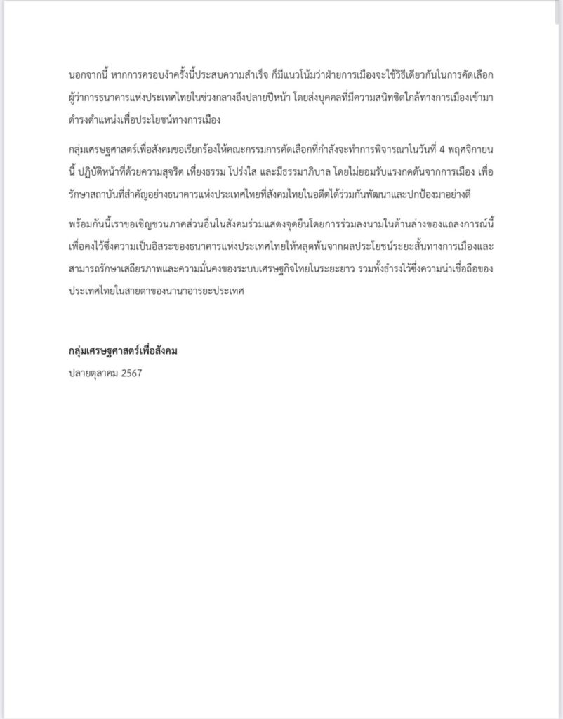 นอกจากนี้ หากการครอบงำครั้งนี้ประสบความสำเร็จ ก็มีแนวโน้มว่าฝ่ายการเมืองจะใช้วิธีเดียวกันในการคัดเลือกผู้ว่าการธนาคารแห่งประเทศไทยในช่วงกลางถึงปลายปีหน้า โดยส่งบุคคลที่มีความสนิทชิดใกล้ทางการเมืองเข้ามาดำรงตำแหน่งเพื่อประโยชน์ทางการเมือง กลุ่มเศรษฐศาสตร์เพื่อสังคมขอเรียกร้องให้คณะกรรมการคัดเลือกที่กำลังจะทำการพิจารณาในวันที่ 4 พฤศจิกายนนี้ ปฏิบัติหน้าที่ด้วยความสุจริต เที่ยงธรรม โปร่งใส และมีธรรมาภิบาล โดยไม่ยอมรับแรงกดดันจากการเมือง เพื่อรักษาสถาบันที่สำคัญอย่างธนาคารแห่งประเทศไทยที่สังคมไทยในอดีตได้ร่วมกันพัฒนาและปกป้องมาอย่างดี