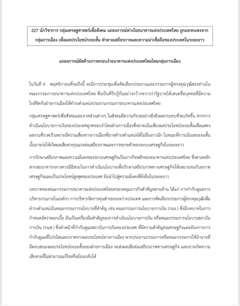 โดยเนื้อหาระบุว่า แถลงการณ์คัดค้านการครอบงําธนาคารแห่งประเทศไทยโดยกลุ่มการเมือง
