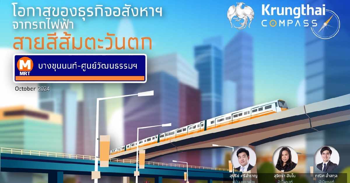 กรุงเทพฯ 31 ต.ค.- ศูนย์วิจัย Krungthai COMPASS ประเมินโครงการรถไฟฟ้าสายสีส้มตะวันตก “บางขุนนนท์-ศูนย์วัฒนธรรมฯ” หนุนการขยายตัวของเมือง และช่วยกระตุ้นตลาดที่อยู่อาศัยโดยรอบรถไฟฟ้า คาดในอนาคตมูลค่าเพิ่มขึ้นจาก 39,000 ล้านบาทต่อปี เป็น 50,000 ล้านบาทต่อปี