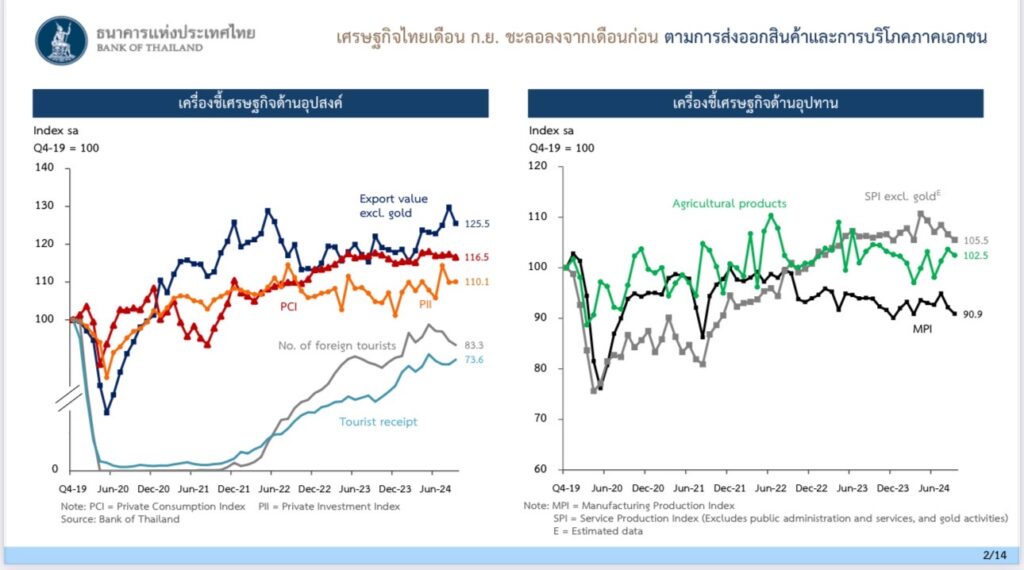 โฆษก ธปท.ยังเปิดเผยว่าภาวะเศรษฐกิจไทยเดือน ก.ย.67 ชะลอลงจากเดือนก่อนหน้า ตามการส่งออกสินค้าและการบริโภคภาคเอกชน ขณะที่การลงทุนภาคเอกชนทรงตัว อย่างไรก็ดี รายรับจากนักท่องเที่ยวต่างชาติเพิ่มขึ้น และการใช้จ่ายภาครัฐขยายตัว ทั้งรายจ่ายประจำ และรายจ่ายลงทุน ส่วนอัตราเงินเฟ้อทั่วไป เพิ่มขึ้นจากเดือนก่อนในทุกหมวด โดยหมวดพลังงานเพิ่มขึ้นจากผลของฐานต่ำในปีก่อน ที่มีมาตรการช่วยเหลือของภาครัฐ หมวดอาหารสดเพิ่มขึ้นตามราคาผัก ด้านดุลบัญชีเดินสะพัด เกินดุลลดลงตามดุลบริการ รายได้ และเงินโอน ที่ขาดดุลเพิ่มขึ้นจากทั้งรายรับภาคท่องเที่ยว รวมถึงการส่งกลับกำไรและเงินปันผลของธุรกิจ ขณะที่ดุลการค้าเกินดุลใกล้เคียงกับเดือนก่อน โดยจำนวนนักท่องเที่ยวต่างประเทศ อยู่ที่ 2.5 ล้านคน ลดลงจากเดือนก่อน ตามจำนวนนักท่องเที่ยวจีนที่ชะลอการเดินทาง