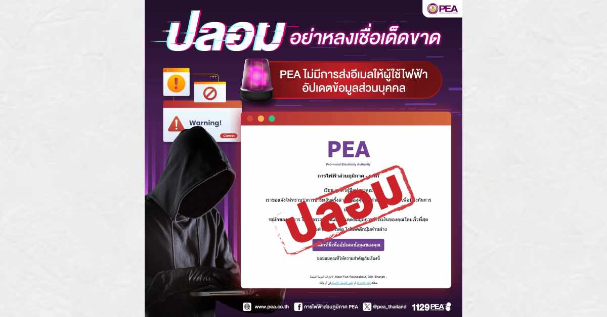 กรุงเทพฯ 1 พ.ย. – การไฟฟ้าส่วนภูมิภาค (PEA) ย้ำ PEA ไม่มีการส่งอีเมลให้ผู้ใช้ไฟฟ้าอัปเดตข้อมูลส่วนบุคคล จึงขอแจ้งเตือนประชาชนให้ระมัดระวังกลุ่มมิจฉาชีพแอบอ้างส่งอีเมลให้ผู้ใช้ไฟฟ้าอัปเดตข้อมูลส่วนบุคคลดังกล่าว