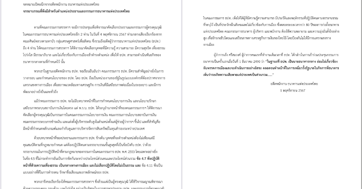 อดีตพนักงานธนาคารแห่งประเทศไทย (ธปท.) 416 คน ร่วมลงชื่อออกจดหมายเปิดผนึก เรื่อง “จรรยาบรรณที่พึงมีสำหรับตำแหน่งประธานและกรรมการธนาคารแห่งประเทศไทย” โดยมีเนื้อหาระบุว่า ตามที่คณะกรรมการสรรหาฯ จะมีการประชุมเพื่อพิจารณาคัดเลือกประธานและกรรมการผู้ทรงคุณวุฒิในคณะกรรมการธนาคารแห่งประเทศไทยอีก 2 ท่าน ในวันที่ 4 พฤศจิกายน 2567 ท่ามกลางเสียงเรียกร้องจากคณะศิษย์หลวงตามหาบัว กลุ่มเศรษฐศาสตร์เพื่อสังคม ซึ่งรวมถึงอดีตผู้ว่าการธนาคารแห่งประเทศไทย (ธปท.) ถึง 4 ท่าน ให้คณะกรรมการสรรหาฯ ได้พิจารณาคัดเลือกบุคคลที่มีความรู้ ความสามารถ มีความสุจริต เที่ยงธรรม โปร่งใส มีธรรมาภิบาล และไม่เกี่ยวข้องกับการเมืองเข้าดำรงตำแหน่ง เพื่อให้ ธปท. สามารถดำเนินพันธกิจของธนาคารกลางตามที่กำหนดไว้นั้น