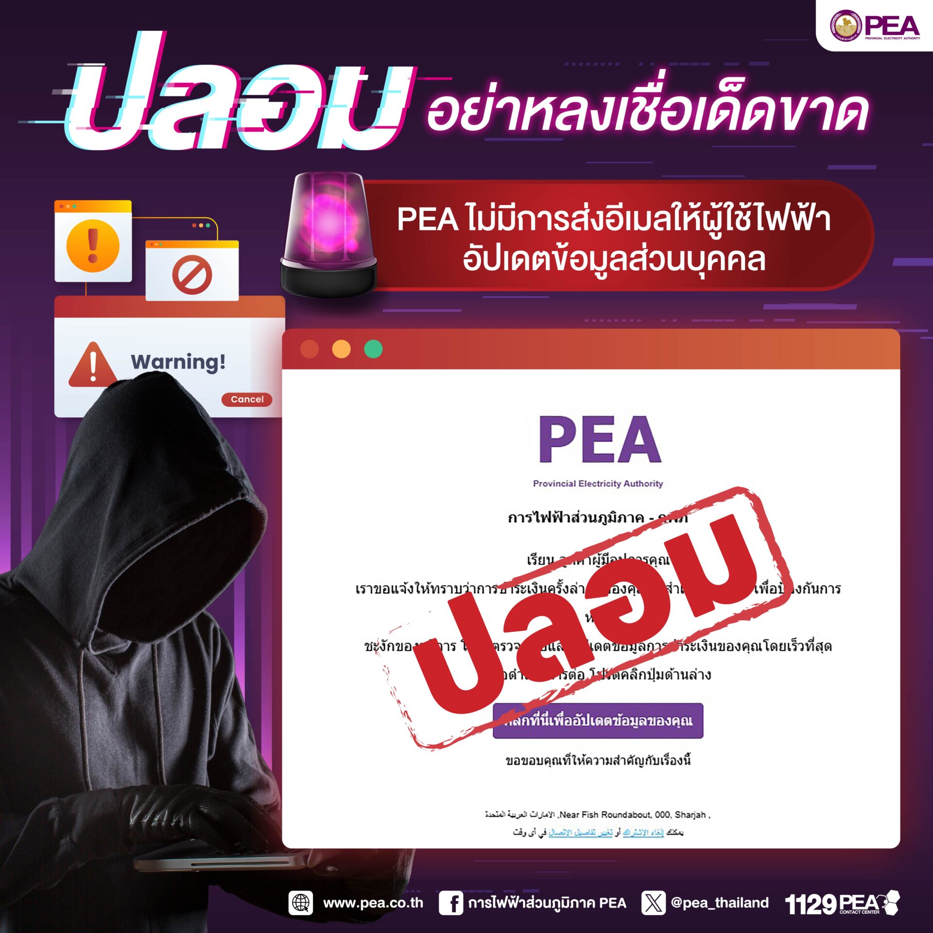 การไฟฟ้าส่วนภูมิภาค (PEA) ขอเรียนให้ทราบว่า PEA ไม่มีการส่งอีเมลให้ผู้ใช้ไฟฟ้าอัปเดตข้อมูลส่วนบุคคล จึงขอแจ้งเตือนประชาชนให้ระมัดระวังกลุ่มมิจฉาชีพแอบอ้างส่งอีเมลให้ผู้ใช้ไฟฟ้าอัปเดตข้อมูลส่วนบุคคลดังกล่าว