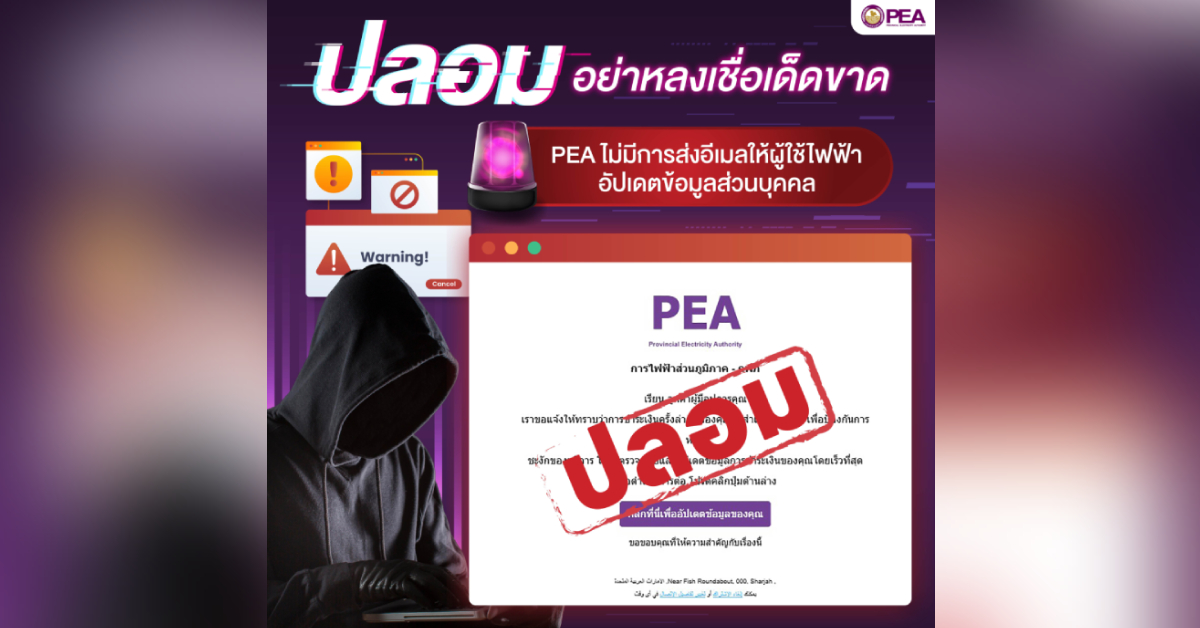 3 พ.ย. – PEA เตือนระวังกลุ่มมิจฉาชีพ ส่งอีเมลให้ผู้ใช้ไฟฟ้าอัปเดตข้อมูลส่วนบุคคล