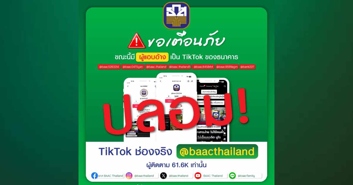 ธ.ก.ส.ขอย้ำเตือนให้ลูกค้าเพิ่มความระมัดระวังในการติดต่อหรือทำธุรกรรมออนไลน์ เนื่องด้วยปัจจุบันมิจฉาชีพมีรูปแบบการหลอกลวงที่หลากหลาย หากไม่แน่ใจในข้อมูลที่ได้รับมา โปรดติดต่อธนาคารโดยตรง หรือสอบถามรายละเอียดเพิ่มเติมได้ที่ BAAC ศูนย์รับแจ้งเหตุภัยทางการเงินจากมิจฉาชีพ Call Center : 02 555 0555 กด 111 ได้ตลอด 24 ชม. และติดตามข้อมูลและข่าวสารด้านผลิตภัณฑ์และบริการผ่านช่องทางการสื่อสารหลักของธนาคาร ได้แก่ เว็บไซต์ www.baac.or.th Facebook Page “ธกส BAAC Thailand” LINE Official: @baacfamily และ TikTok: @baacthailand.-515- สำนักข่าวไทย