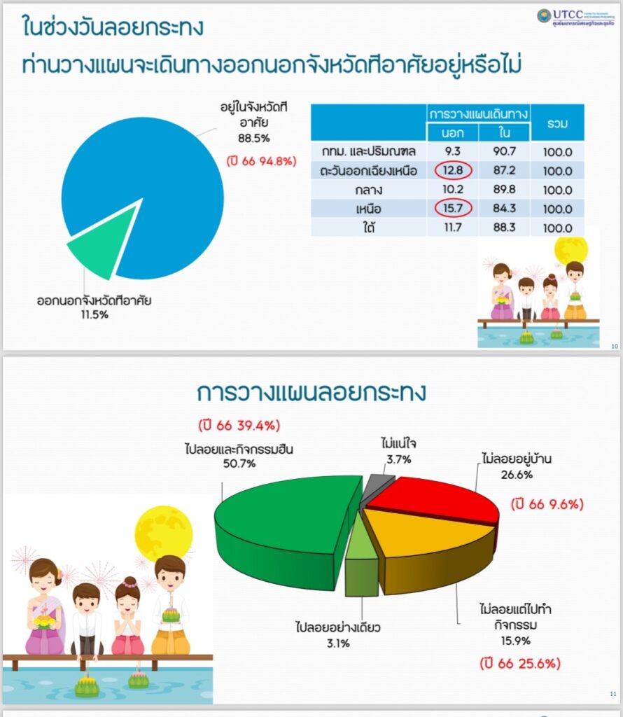 ดร.ธนวรรธน์ กล่าวเพิ่มเติมว่า เทศกาลลอยกระทงในวันที่ 15 พ.ย.นี้ จากผลสำรวจพบว่าประชาชนพร้อมออกไปลอยกระทงเพิ่มขึ้น และมีค่าใช้จ่ายต่อหัว 10,400 บาท นับว่าสูงสุดในรอบ 9 ปี หรือเพิ่มขึ้นร้อยละ 3.5 จากปีก่อน นับว่ามีสัญญาณทางเศรษฐกิจฟื้นตัวดีขึ้น แต่ยังระมัดระวังการใช้จ่ายไม่ให้ฟุ่มเฟือย สอดคล้องกับเงินเฟ้อในปัจจุบัน ยอมรับว่าการแจกเงิน 1 หมื่นบาท ให้กับกลุ่มเปราะบาง 14.5 ล้านคน วงเงิน 1.45 แสนล้านบาท เกิดเงินหมุนเวียนในระบบเศรษฐกิจไม่มากนัก เพราะปัญหาน้ำท่วมหลายพื้นที่ จึงถูกดูดซับเงินดังกล่าวไป 5-6 หมื่นล้านบาท เพื่อนำไปซ่อมแซม ทรัพย์สิน บ้านเรือน.-515- สำนักข่าวไทย