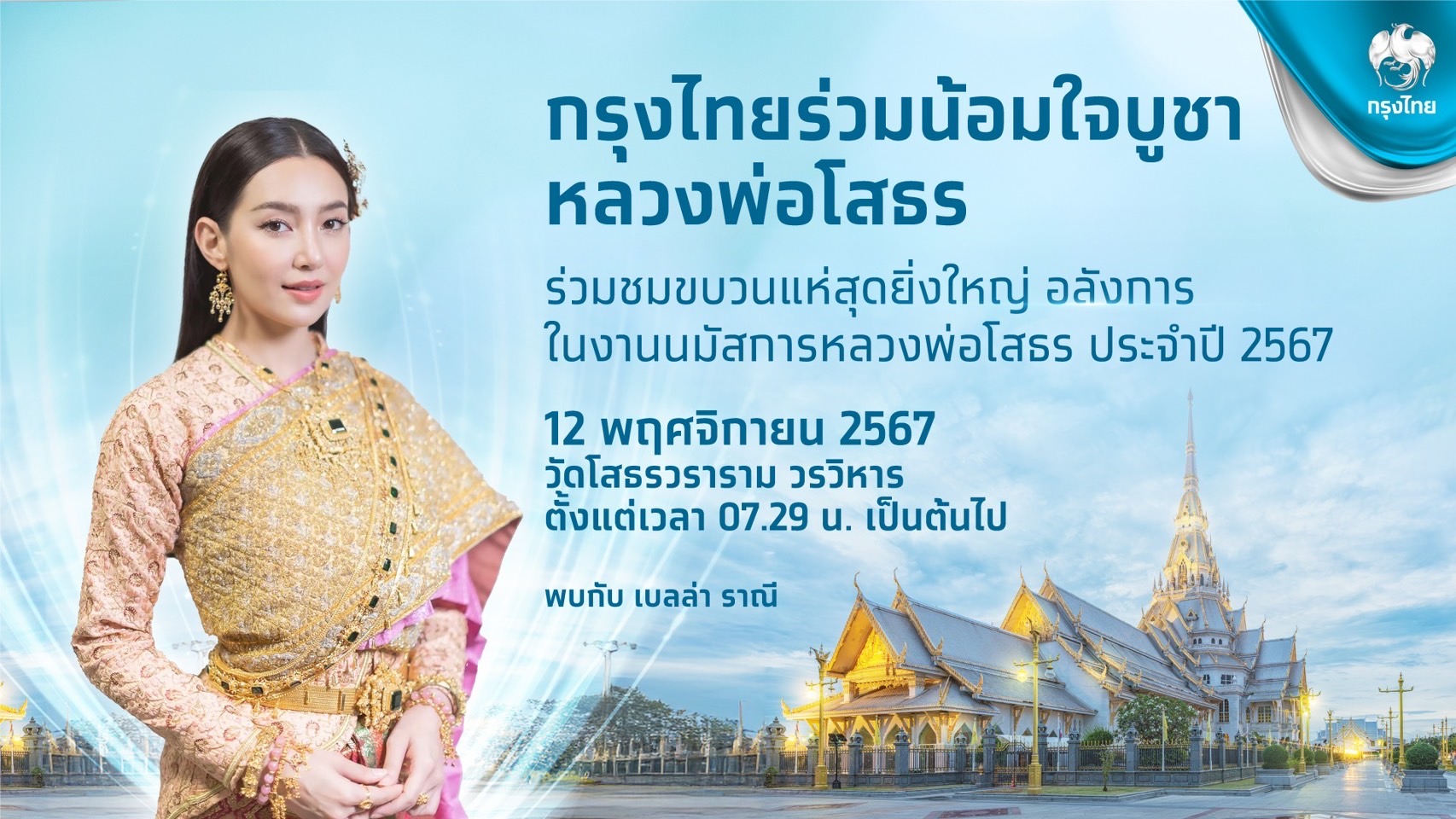 กรุงเทพฯ 6 พ.ย. – กรุงไทยชวนเที่ยวงานหลวงพ่อโสธร ดึง “เบลล่า ราณี” ร่วมริ้วขบวน “ปักษาวายุภักษ์นครา สู่สายศรัทธาแห่งความยั่งยืน” 12 พ.ย.นี้