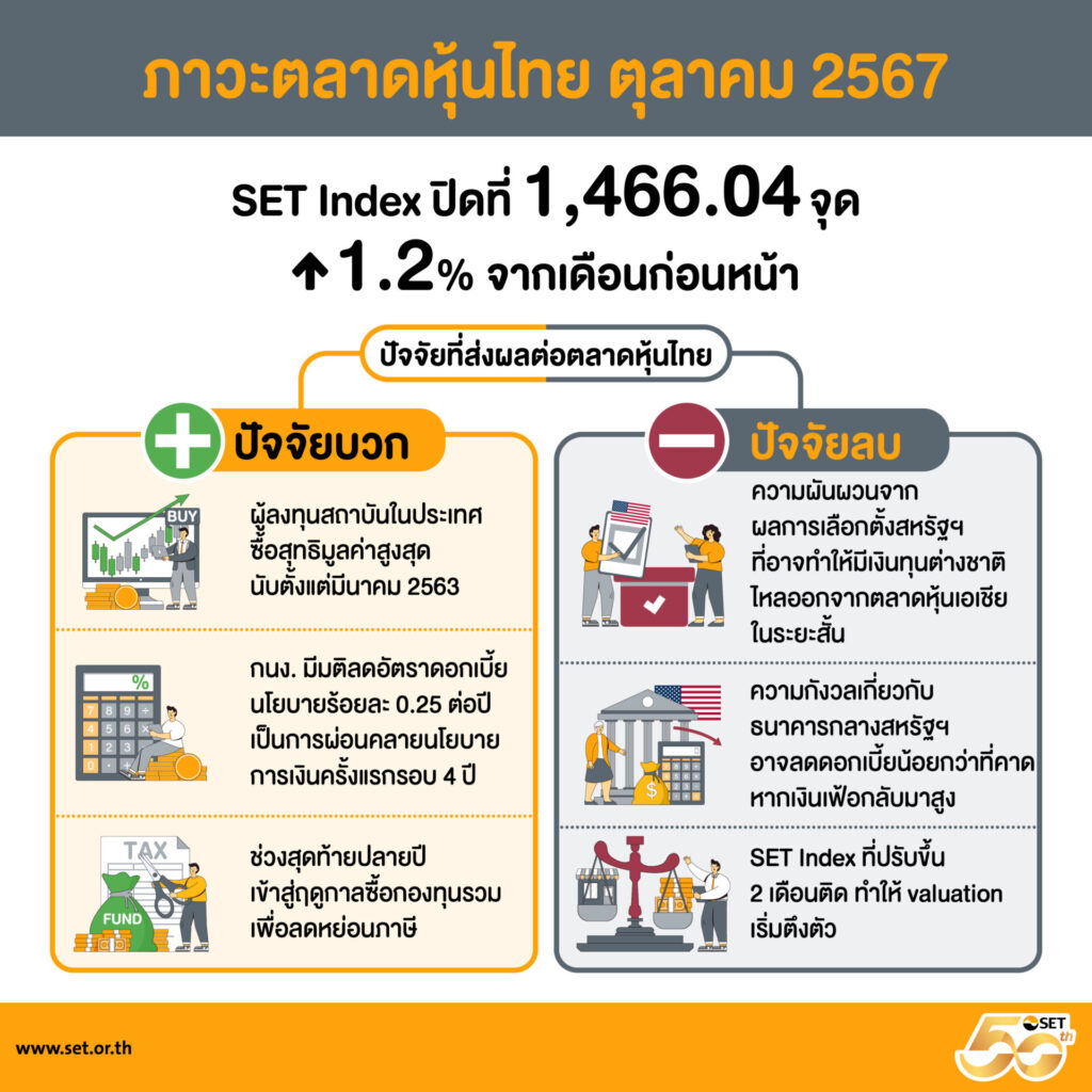 • ณ สิ้นเดือนตุลาคม SET Index ปิดที่ 1,466.04 จุด เพิ่มขึ้น 1.2% จากสิ้นเดือนกันยายน ซึ่งเป็นการปรับตัวเพิ่มขึ้นมากกว่าค่าเฉลี่ยของภูมิภาค ทำให้เมื่อเทียบกับสิ้นปี 2566 SET Index ปรับตัวเพิ่มขึ้น 3.5%