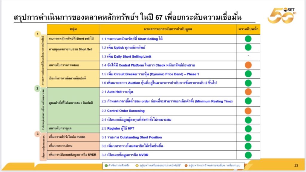ขณะที่บทบาทของตลาดหลักทรัพย์ฯ ในการกำกับดูแลสมาชิก มีการทบทวนหลักเกณฑ์ที่เกี่ยวข้องอย่างต่อเนื่อง เพื่อให้การซื้อขายหลักทรัพย์จดทะเบียนเป็นไปด้วยความเป็นธรรมและเป็นระเบียบเรียบร้อย (Fair & Orderly) และเพื่อให้การกำกับดูแลสมาชิกเป็นไปโดยมีประสิทธิภาพ สอดคล้องตามสภาวะของตลาดทุนในแต่ละช่วงเวลา โดยในปี 2567 ตลาดหลักทรัพย์ฯ ได้ปรับปรุงหลักเกณฑ์ที่เกี่ยวข้อง เช่น เกณฑ์การซื้อขายหลักทรัพย์ (กำหนด Dynamic Price Band / Minimum Resting Time / การซื้อขายหุ้นที่อยู่ในมาตรการกำกับการซื้อขายด้วยวิธี Auction), เกณฑ์การขายชอร์ต (ทบทวนหลักทรัพย์ที่สามารถทำการขายชอร์ตได้) และล่าสุด เมื่อ1 พ.ย. 2567 ที่ผ่านมา เริ่มใช้บังคับบทระวางโทษปรับเป็นเงินสำหรับสมาชิกที่ปรับปรุงใหม่