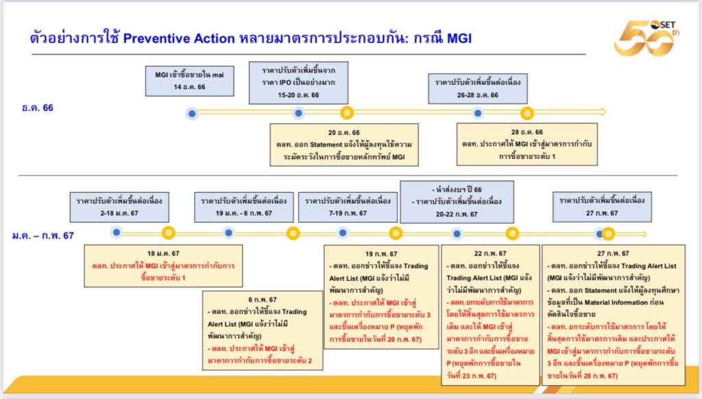 นายรองรักษ์ พนาปวุฒิกุล รองผู้จัดการ ในฐานะโฆษกตลาดหลักทรัพย์แห่งประเทศไทย (ตลท.) กล่าวถึง “การดูแลการซื้อขายหลักทรัพย์จดทะเบียน และการกำกับดูแลสมาชิกโดยตลาดหลักทรัพย์ฯ” ว่าทำหน้าที่ในการติดตามภาวะการซื้อขายหลักทรัพย์ ในตลาดหลักทรัพย์ฯ และติดตามการเปิดเผยข่าวของบริษัทจดทะเบียน โดยในรอบปี 2567 เมื่อมีการพิจารณาในเบื้องต้นเห็นว่ามีมูลในการกระทำความผิด จะส่งเรื่องให้สำนักงานคณะกรรมการกำกับหลักทรัพย์และตลาดหลักทรัพย์ (ก.ล.ต.) พิจารณาความผิดและดำเนินการทางกฎหมาย โดย มีข้อมูลรายการซื้อขาย (Deals) ในรอบปี 2567 (ข้อมูล ณ วันที่ 1 พ.ย. 67) ประมาณ 106 ล้านรายการ หรือคิดเป็นค่าเฉลี่ย ประมาณ 520,000 รายการ ต่อวัน ขณะที่ข้อมูลข่าวเกี่ยวกับ บจ. ในปี 2567 (ข้อมูล ณ วันที่ 4 พ.ย. 67) มีจำนวนราว 53,000 ข่าว หรือคิดเป็นจำนวนข่าวเกี่ยวกับ บจ. โดยเฉลี่ยประมาณ 260 ข่าว ต่อวัน โดยตัวอย่างที่ชัดเจน ได้แก่ กรณี หลักทรัพย์ บริษัท มิสแกรนด์ อินเตอร์เนชั่นแนล จำกัด (มหาชน) หรือ MGI ที่เข้าข่ายมาตรการกำกับการซื้อขาย ระดับ 3 ถึง 3 ครั้งต่อเนื่องกัน จนเป็นที่มาของการยกระดับมาตรการกำกับการซื้อขายระดับ 3