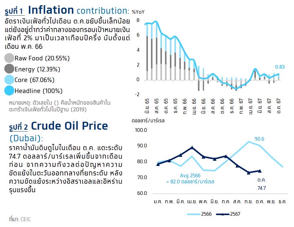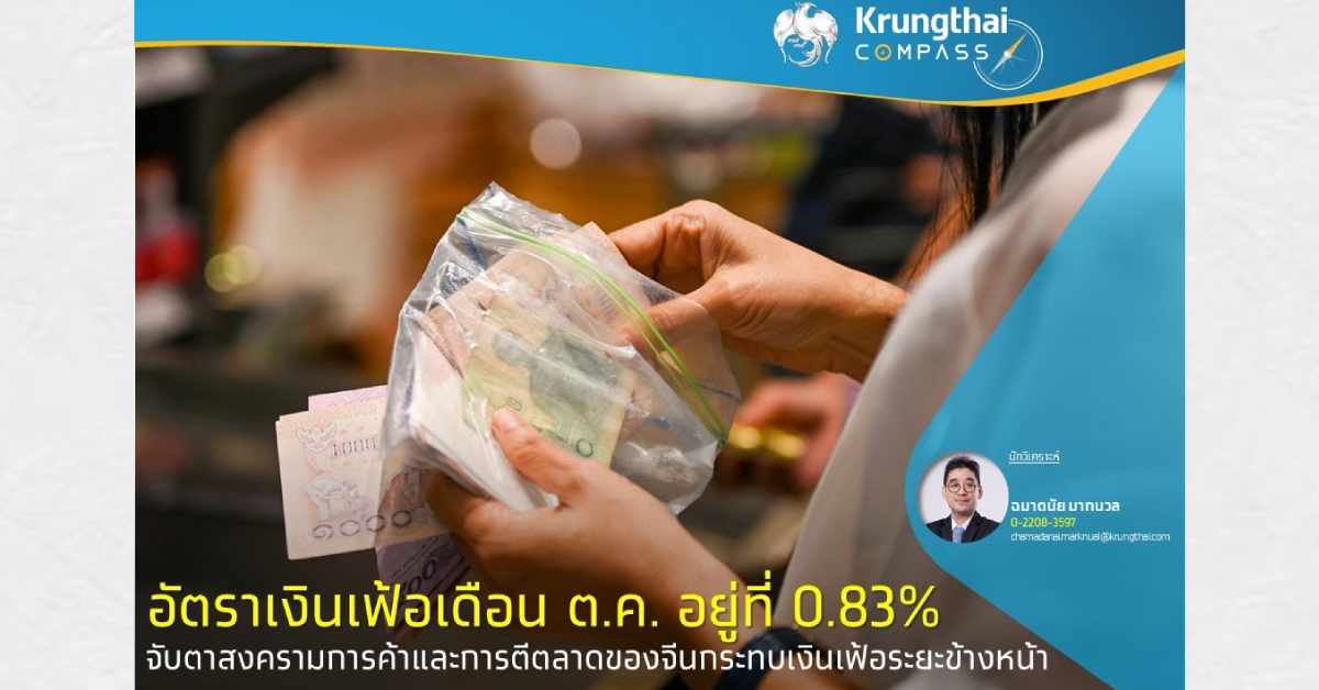 ธนาคารกรุงไทยคาดอัตราเงินเฟ้อทั่วไปเดือน ต.ค. อยู่ที่ 0.83%YoY ขยับขึ้นเล็กน้อยจาก 0.61%YoY ในเดือนก่อน ส่วนหนึ่งเป็นผลจากการปรับตัวสูงขึ้นของราคาน้ำมันหลังความขัดแย้งในตะวันออกกลางยกระดับ ประกอบกับผลของฐานราคาพลังงานต่ำเมื่อปีก่อน ด้านอัตราเงินเฟ้อพื้นฐานทรงตัวอยู่ในระดับต่ำที่ 0.77%YoY เท่ากับเดือนก่อน อัตราเงินเฟ้อทั่วไปในช่วง 10 เดือนแรกของปี 0.26%YoY ขณะที่อัตราเงินเฟ้อพื้นฐานอยู่ที่ 0.52%YoY