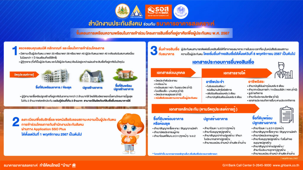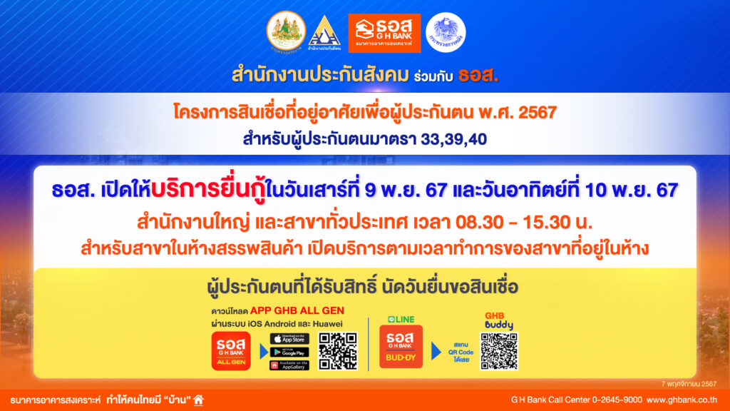 ตามที่กระทรวงแรงงาน โดยสำนักงานประกันสังคม (สปส.) ร่วมกับ ธอส.จัดทำโครงการสินเชื่อที่อยู่อาศัยเพื่อผู้ประกันตน 2567 วงเงิน 10,000 ล้านบาท ปล่อยสินเชื่ออัตราดอกเบี้ยต่ำ 5 ปีแรก เพียง 1.59% ต่อปี ให้กับผู้ประกันตนตามมาตรา 33, 39 หรือ 40 ที่ต้องการซื้อ หรือปลูกสร้างที่อยู่อาศัย ผ่อนคงที่นาน 5 ปี โดยให้ผู้ประกันตนที่ได้รับสิทธิ์เข้าร่วมโครงการฯ สามารถยื่นขอสินเชื่อที่ ธอส. ทุกสาขาทั่วประเทศ ได้ตั้งแต่วันที่ 8 พฤศจิกายน 2567 เป็นต้นไป ธอส. พร้อมเปิดให้ผู้ประกันตนที่ได้รับสิทธิ์ยื่นขอสินเชื่อทุกสาขาทั่วประเทศในวันเสาร์ 9 พฤศจิกายน 2567 และวันอาทิตย์ 10 พฤศจิกายน 2567 ตามเวลาทำการของสาขาที่อยู่ในห้าง รวมทั้งเปิดให้นัดวันยื่นขอสินเชื่อล่วงหน้าผ่าน Application : GHB ALL GEN และ GHB Buddy บน Line Application