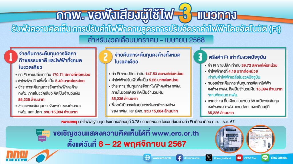กรุงเทพฯ 8 พ.ย. – “กกพ.” เสนอ 3 ทางเลือกค่าไฟงวด ม.ค.- เม.ย.68 ที่ 4.18-5.49 บาทต่อหน่วย มองแนวโน้มต้นทุนค่าไฟลดลง (จากเงินบาทที่แข็งค่า) ชี้เป็นจังหวะดีเร่งใช้คืนหนี้ค่าเชื้อเพลิงคงค้างที่ยังสูงกว่า 100,000 ล้านบาท เพื่อรักษาความมั่นคงให้ระบบ
