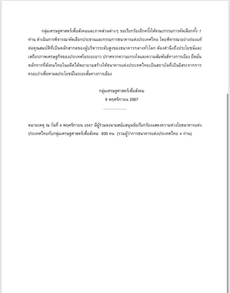 กลุ่มเศรษฐศาสตร์เพื่อสังคมและภาคส่วนต่างๆ ขอเรียกร้องอีกครั้งให้คณะกรรมการคัดเลือกทั้ง 7 ท่าน ดำเนินการพิจารณาคัดเลือกประธานและกรรมการธนาคารแห่งประเทศไทย โดยพิจารณาอย่างถ่องแท้ต่อคุณสมบัติที่เป็นหลักสากลของผู้บริหารระดับสูงของธนาคารกลางทั่วโลก ต้องคำนึงถึงประโยชน์และเสถียรภาพเศรษฐกิจของประเทศในระยะยาว ปราศจากความเกรงใจและความสัมพันธ์ทางการเมือง ยึดมั่นหลักการที่สังคมไทยในอดีตได้พยายามสร้างให้ธนาคารแห่งประเทศไทยเป็นสถาบันที่เป็นอิสระจากการครอบงำเพื่อหาผลประโยชน์ในระยะสั้นทางการเมือง