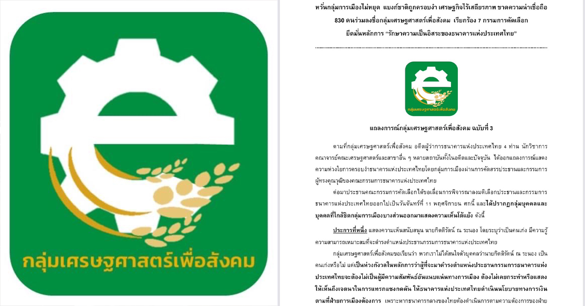 กลุ่มเศรษฐศาสตร์เพื่อสังคม ออกแถลงการณ์ ฉบับที่ 3 โดยเนื้อหาระบุว่า ตามที่กลุ่มเศรษฐศาสตร์เพื่อสังคม อดีตผู้ว่าการธนาคารแห่งประเทศไทย 4 ท่าน นักวิชาการ คณาจารย์คณะเศรษฐศาสตร์และสาขาอื่น ๆ หลายสถาบันทั้งในอดีตและปัจจุบัน ได้ออกแถลงการณ์แสดงความห่วงใยการครอบงำธนาคารแห่งประเทศไทยโดยกลุ่มการเมืองผ่านการคัดสรรประธานและกรรมการผู้ทรงคุณวุฒิของคณะกรรมการธนาคารแห่งประเทศไทย
