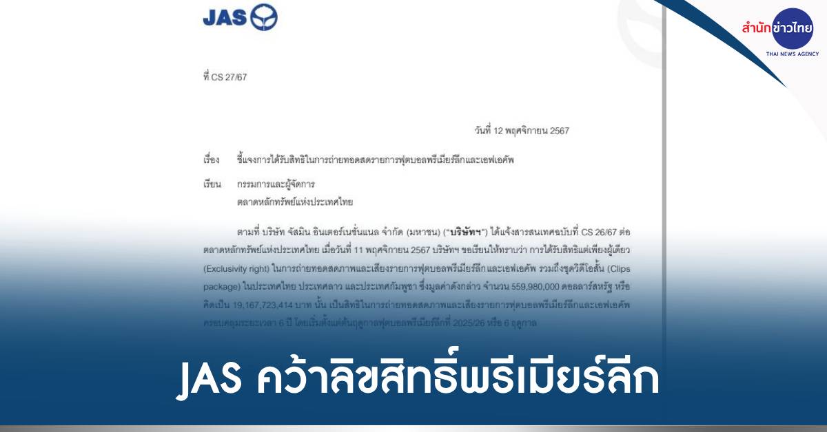 JAS แจ้ง ตลาดหลักทรัพย์ฯว่า ที่ประชุมคณะกรรมการบริษัทอนุมัติให้เข้าทำรายการเพื่อให้ได้รับสิทธิแต่เพียงผู้เดียว (Exclusivity right) ในการถ่ายทอดสดภาพและเสียงรายการฟุตบอลพรีเมียร์ลีกและเอฟเอคัพบนอินเทอร์เน็ตทีวี (Internet TV) และ ดิจิทัล ทีวี (Digital TV) รวมถึงชุดวิดีโอสั้น (Clips package) ตลอดระยะเวลารายการฟุตบอลพรีเมียร์ลีกและเอฟเอคัพ 3 ฤดูกาล เริ่มตั้งแต่ต้นฤดูกาลฟุตบอลพรีเมียร์ลีกที่ 2025/26 หรือ 6 ฤดูกาล ในกรณีที่บริษัท ได้รับแจ้งจาก The Football Association Premier League Limited (FAPL) เป็นลายลักษณ์อักษรภายในวันที่ 1 ธันวาคม 2567 ในประเทศไทย ประเทศลาว และประเทศกัมพูชา โดยมีมูลค่ารวมทั้งสิ้น 559,980,000 ดอลลาร์สหรัฐ หรือคิดเป็น 19,167,723,414 บาท