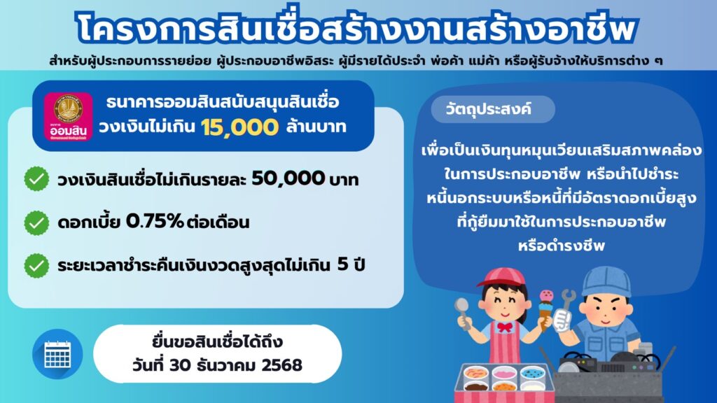 นายคารม พลพรกลาง รองโฆษกประจำสำนักนายกรัฐมนตรี เปิดเผยว่าที่ประชุม ครม.เห็นชอบ โครงการสินเชื่อ สร้างงานสร้างอาชีพของธนาคารออมสิน จากภาวะเศรษฐกิจชะลอตัว ต้นทุนการผลิต และราคาสินค้าแพง ต้นทุนประกอบอาชีพสูง ส่งผลให้ประชาชนประสบกับปัญหาสภาพคล่อง ธนาคารออมสิน จึงพร้อมปล่อยกู้ “สร้างงานสร้างอาชีพ” วงเงิน 15,000 ล้านบาท เพื่อเป็นเงินทุนหมุนเวียน เสริมสร้างสภาพคล่องในการประกอบอาชีพและนำไปชำระหนี้นอกระบบหรือหนี้ที่มีอัตราดอกเบี้ยสูงที่กู้ยืมมาใช้ในการประกอบอาชีพและดำรงชีพ ปล่อยกู้สูงสุดไม่เกินรายละ 50,000 บาท กลุ่มเป้าหมาย ผู้ประกอบการรายย่อย ผู้ประกอบอาชีพอิสระ ผู้มีรายได้ประจำ ลูกจ้าง พ่อค้า แม่ค้า หรือผู้รับจ้างให้บริการทั่วไป มีอายุครบ 20 ปี บริบูรณ์ขึ้นไป แต่ไม่เกิน 65 ปี บริบูรณ์ ชำระเงินต้นและดอกเบี้ยเป็นงวดรายเดือน ชำระคืนสูงสุดไม่เกิน 5 ปี (60 งวด) คิดดอกเบี้ยคงที่ร้อยละ 0.75 ต่อเดือน (Flat Rate) ไม่มีหลักประกัน (Clean Loan) ให้บริการผ่านช่องทางที่ธนาคารกำหนด