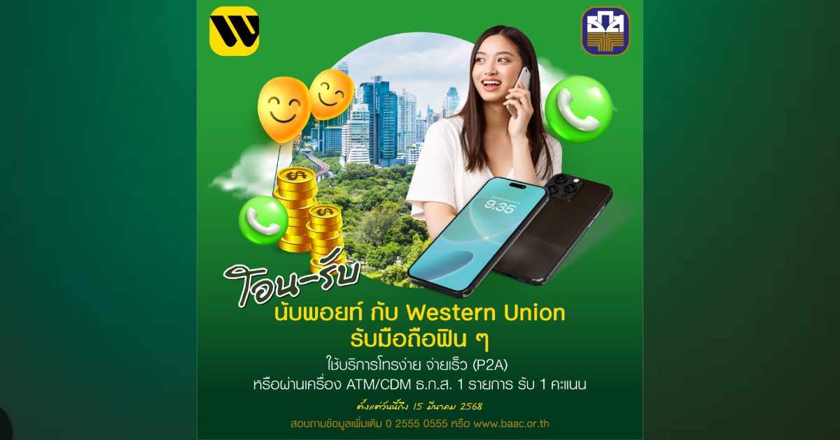 ธนาคารเพื่อการเกษตรและสหกรณ์การเกษตร (ธ.ก.ส.) จัด 3 แคมเปญพิเศษ สำหรับลูกค้าที่สมัครและใช้บริการโอนเงินระหว่างประเทศ Western Union ผ่านตู้ ATM/CDM ธ.ก.ส. รับสิทธิประโยชน์มากมาย อาทิ แคมเปญที่ 1 เมื่อสมัครและใช้บริการ Western Union ผ่านตู้ ATM/CDM ธ.ก.ส. รับ Cash Back เข้าบัญชีเงินฝาก ธ.ก.ส. จำนวน 100 บาท 1 รายต่อ 1 สิทธิ์ (จำกัด 1,000 สิทธิ์ตลอดระยะเวลาแคมเปญ) ตั้งแต่วันนี้ถึง 15 มีนาคม 2568
