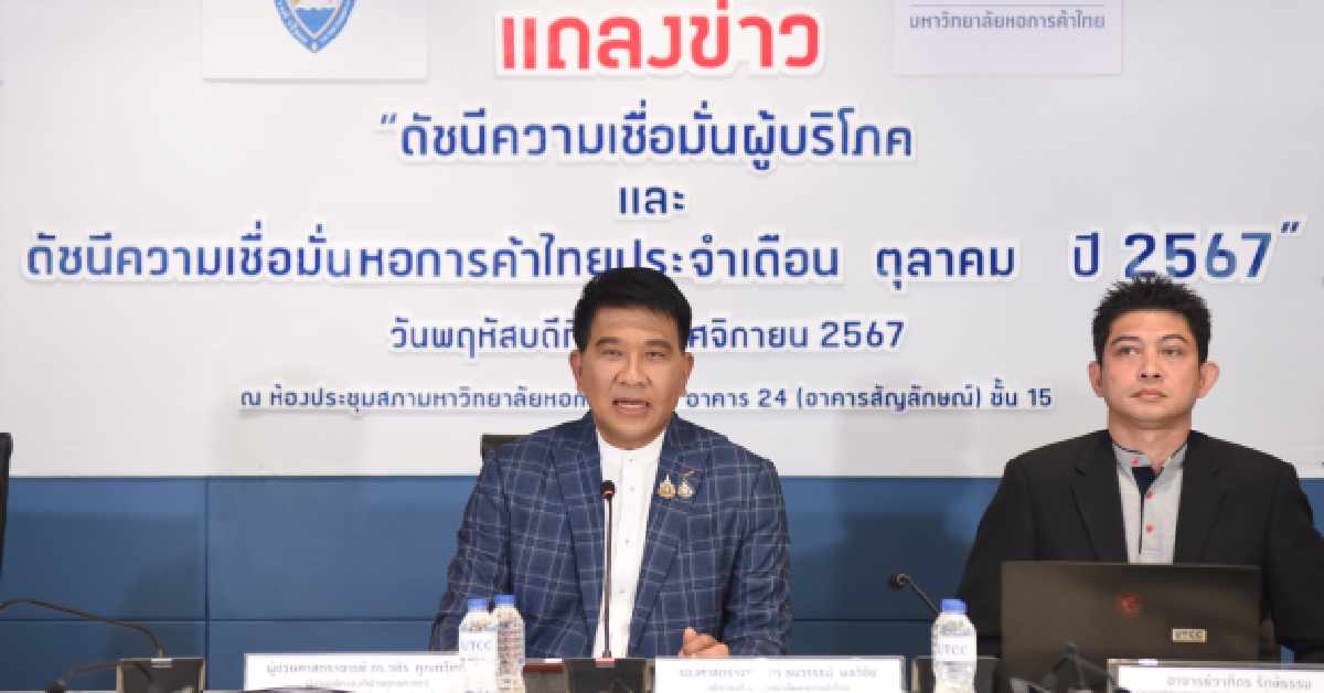 รศ.ดร.ธนวรรธน์ พลวิชัย ประธานที่ปรึกษาศูนย์พยากรณ์เศรษฐกิจและธุรกิจ และอธิการบดี มหาวิทยาลัยหอการค้าไทย กล่าวถึงสำรวจดัชนีความเชื่อมั่นหอการค้าไทย (TCC CONFIDENCE INDEX) ซึ่งสำรวจโดยหอการค้าไทยร่วมกับศูนย์พยากรณ์เศรษฐกิจและธุรกิจ มหาวิทยาลัยหอการค้าไทย พบว่า ดัชนีความเชื่อมั่นหอการค้าไทยประจำเดือนตุลาคม 2567 ประเด็นสถานการณ์เศรษฐกิจของจังหวัด ประจำเดือนตุลาคม 2567 ส่วนใหญ่คิดเป็น 35.3% เห็นว่า ไม่เปลี่ยนแปลง 35.2% เห็นว่า แย่ลง และ 29.5% เห็นว่า ดีขึ้น แต่คาดการณ์ในอีก 6 เดือนข้างหน้า ส่วนใหญ่ 45.3% เห็นว่า ดีขึ้น อีก 37.5% เห็นว่า แย่ลง และ 17.2% เห็นว่า ไม่เปลี่ยนแปลง
