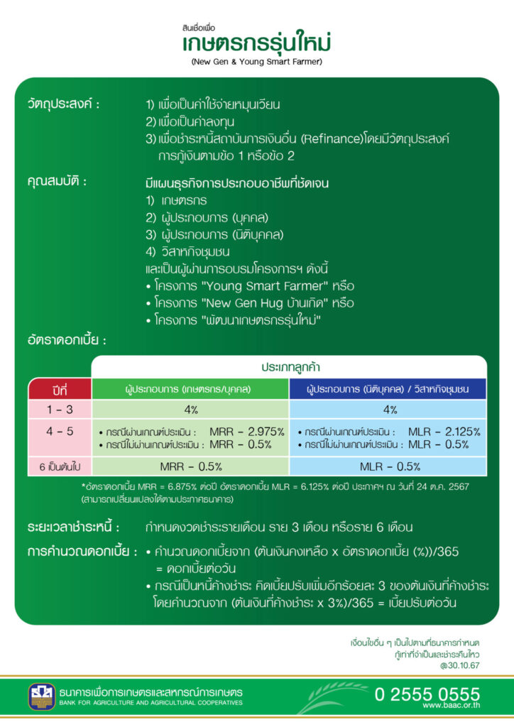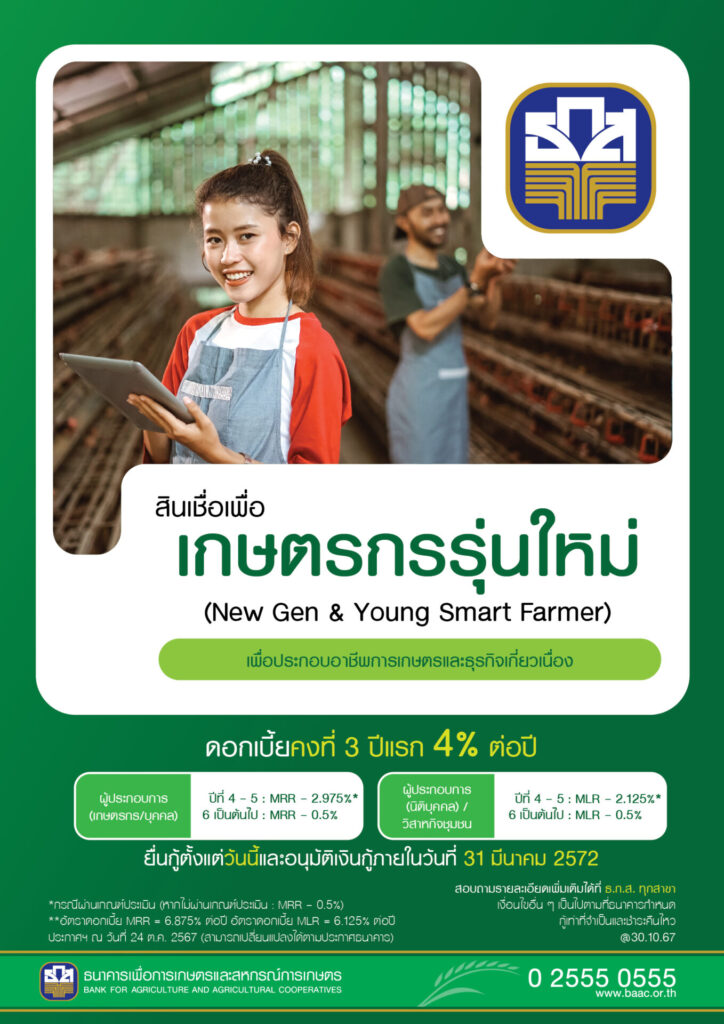 นายฉัตรชัย ศิริไล ผู้จัดการธนาคารเพื่อการเกษตรและสหกรณ์การเกษตร (ธ.ก.ส.) กล่าวว่า เพื่อสนับสนุนทายาทเกษตรกรรุ่นใหม่เข้ามารับช่วงต่อเกษตรกรผู้สูงอายุให้มีเงินทุน นำนวัตกรรมและเทคโนโลยีเข้ามาพัฒนากระบวนการผลิต สร้างมูลค่าเพิ่มให้สินค้าเกษตร (Value Added) ที่ตอบโจทย์ความต้องการของตลาดในปัจจุบัน ธ.ก.ส. จึงนำโครงการสินเชื่อเพื่อเกษตรกรรุ่นใหม่ (New Gen & Young Smart Farmer) วงเงินสินเชื่อรวม 10,000 ล้านบาท อัตราดอกเบี้ยร้อยละ 4 ต่อปี คงที่ 3 ปีแรก โดยในปีที่ 3 จะมีการตรวจประเมินศักยภาพ กรณีเกษตรกรหรือผู้ประกอบการบุคคลที่ผ่านเกณฑ์ประเมิน ปีที่ 4-5 อัตราดอกเบี้ย MRR ลบร้อยละ 2.975 ต่อปี (ปัจจุบันอัตราดอกเบี้ย MRR เท่ากับร้อยละ 6.875 ต่อปี)