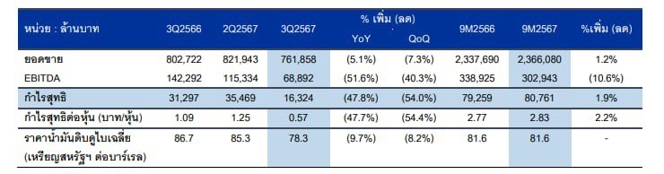 ทั้งนี้ GC ได้ตั้ง ด้อยค่าสินทรัพย์ จาก PTTAC ประมาณ 4,300 ล้านบาท และด้อยค่าสินทรัพย์ในกลุ่มบริษัท Vencorex ประมาณ 3,800 ล้านบาท และเป็นส่วนที่กระทบมายังผลประกอบการไตรมาส 3/67 ขาดทุน และเป็นส่วนทำให้ บมจ.ปตท.กำไรสุทธิ ไตรมาส 3/67 ลดลง 47% เหลือ 1.6 หมื่นล้านบาท โดย ปตท.รายงานผลประกอบการในไตรมาส 3 ปี 2567 มีกำไรจากการดำเนินงานก่อนค่าเสื่อมราคาและค่าตัดจำหน่าย ต้นทุนทางการเงิน และภาษีเงินได้ (EBITDA) จำนวน 68,892 ล้านบาท ลดลง73,400 ล้านบาท หรือ 51.6 % จากไตรมาส 3 ปี 2566 ที่จำนวน 142,292 ล้านบาท โดยหลักจากกลุ่มธุรกิจปิโตรเคมีและการกลั่นที่มีผลการดำเนินงานลดลง โดยธุรกิจการกลั่นมีผลการดำเนินงานลดลงจากผลขาดทุนสตอกน้ำมันที่เพิ่มขึ้น ซึ่ง ปตท. และบริษัทย่อยมีผลขาดทุนสตอกน้ำมันในไตรมาส 3/2567 ประมาณ 20,000 ล้านบาท ขณะที่ในไตรมาส 3/2566 มีกำไรประมาณ 20,000 ล้านบาท กำไรขั้นต้นจากการกลั่น (Market GRM) ลดลงจาก 11.3 เหรียญสหรัฐฯ ต่อบาร์เรล ในไตรมาส 3/2566 เหลือ 2.9 เหรียญสหรัฐฯ ต่อบาร์เรล ในไตรมาส 3/2567 โดยหลักจากส่วนต่างราคาผลิตภัณฑ์น้ำมันสำเร็จรูปส่วนใหญ่กับน้ำมันดิบที่ปรับลดลง ส่วนต่างราคาผลิตภัณฑ์กับวัตถุดิบที่ปรับตัวสูงขึ้น