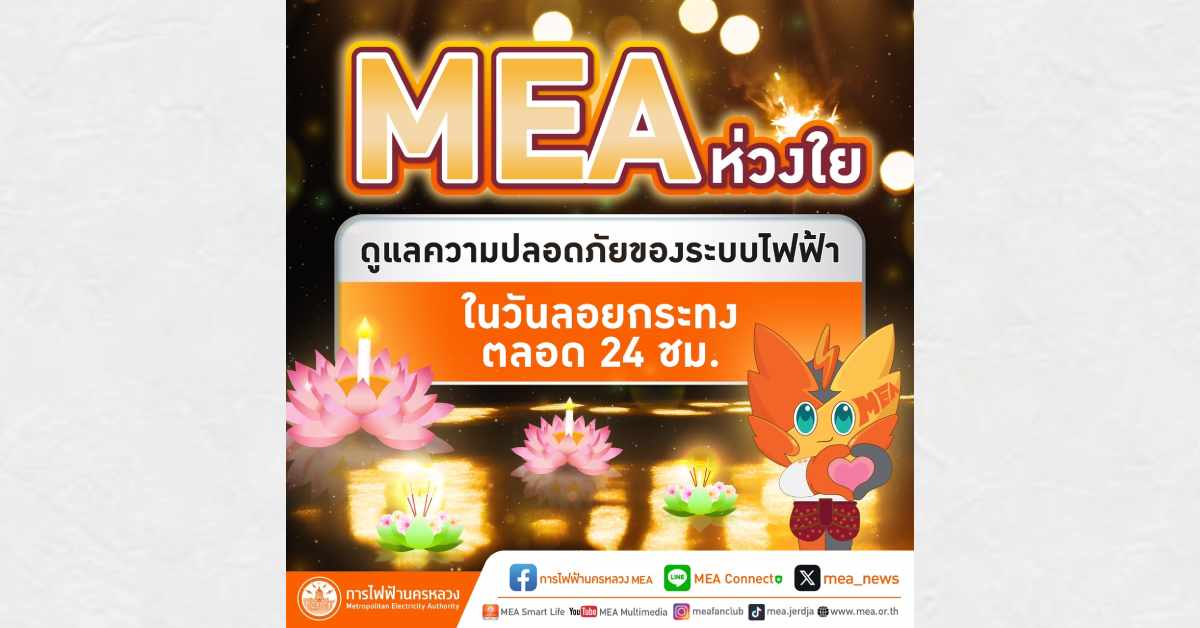 นายคมกริช สาคริก ผู้อำนวยการฝ่ายสื่อสารองค์กรการไฟฟ้านครหลวง หรือ MEA เปิดเผยว่า MEA ในฐานะรัฐวิสาหกิจที่จำหน่ายดูแลระบบไฟฟ้าสังกัดกระทรวงมหาดไทย ในพื้นที่กรุงเทพมหานคร นนทบุรี และสมุทรปราการ วันศุกร์ที่ 15 พฤศจิกายนนี้ เป็นวันลอยกระทง คาดว่าจะมีประชาชนออกมาร่วมลอยกระทง และร่วมงานประเพณี เพื่ออนุรักษ์ สืบสานและส่งเสริมประเพณีลอยกระทงที่ทรงคุณค่า MEA มีความห่วงใยความปลอดภัยของประชาชนจึงได้เตรียมความพร้อมด้านระบบไฟฟ้าตลอด 24 ชั่วโมง โดยจัดเจ้าหน้าที่ลงพื้นที่ตรวจสอบดูแลอุปกรณ์และระบบจ่ายไฟฟ้า รวมถึงตรวจสอบไฟฟ้าส่องสว่างให้มีความเพียงพอ ตรวจสอบไฟฟ้ารั่วตามโครงสร้างป้ายโฆษณา เสาโลหะ ตามสถานที่ในจุดลอยกระทง ท่าน้ำ สถานที่สำคัญ และบริเวณจุดเสี่ยงต่าง ๆ ในพื้นที่ให้บริการ เพื่อร่วมส่งเสริมประเพณีไทย สร้างความสุข ความสว่างไสว ในบรรยากาศแสงไฟประดับที่สวยงามให้แก่ ประชาชนที่มาร่วมงานประเพณีลอยกระทง
