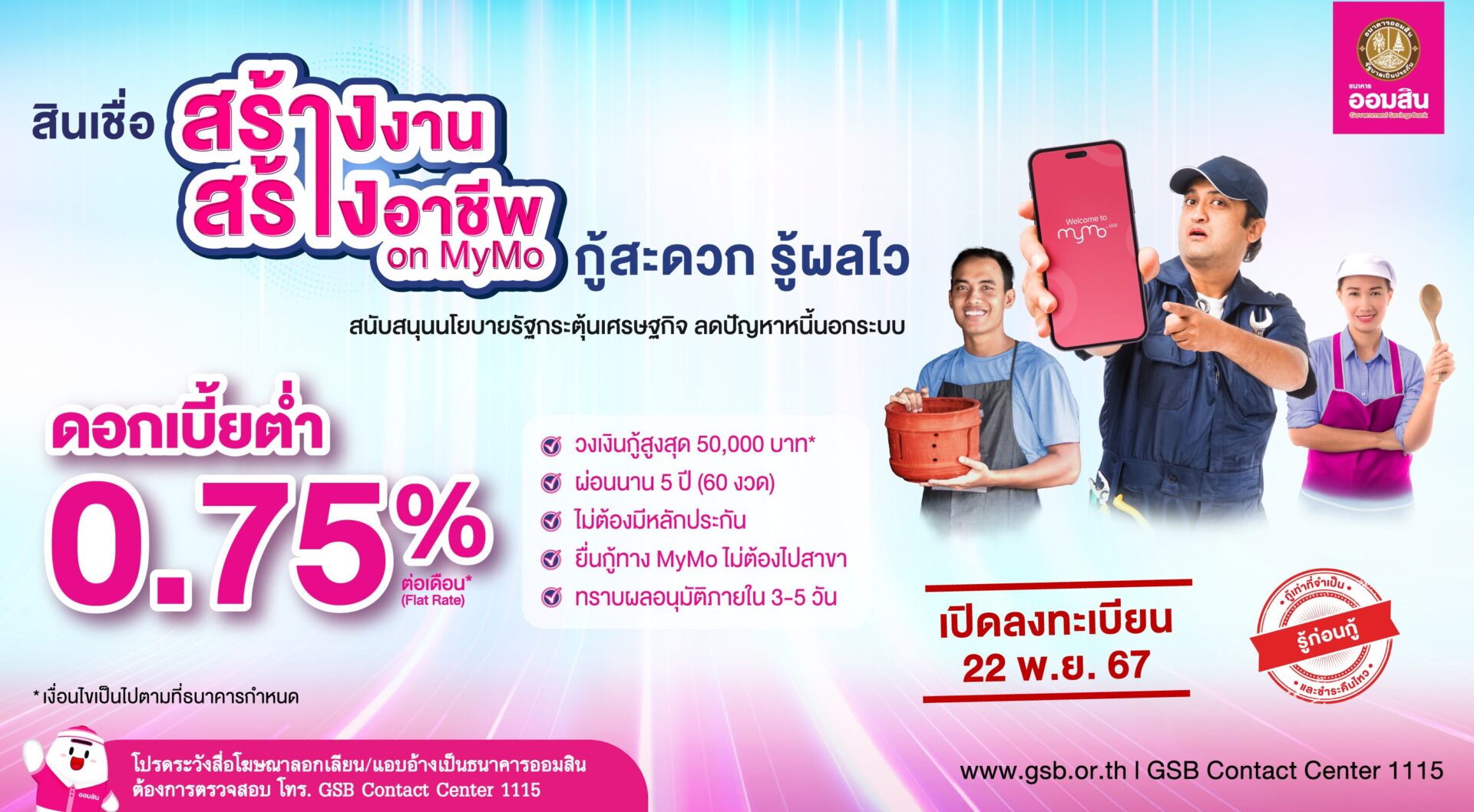 นายวิทัย รัตนากร ผู้อำนวยการธนาคารออมสิน เปิดเผยว่า ตามมติ ครม. เห็นชอบให้ธนาคารจัดทำโครงการสินเชื่อสร้างงานสร้างอาชีพ วงเงินรวม 15,000 ล้านบาท เพื่อเสริมสภาพคล่องของผู้ประกอบการรายย่อย คาดว่าช่วยเหลือประชาชนกว่า 300,000 ราย ให้เข้าถึงสินเชื่อดอกเบี้ยต่ำ เพื่อเป็นทุนหมุนเวียน หรือใช้ชำระหนี้นอกระบบ หรือวงเงินให้กู้สูงสุดไม่เกิน 50,000 บาทต่อราย อัตราดอกเบี้ยคงที่ 0.75% ต่อเดือน ผ่อนชำระสูงสุดไม่เกิน 5 ปี ไม่ต้องมีหลักประกัน ผู้สนใจลงทะเบียนจองสิทธิ์ยื่นขอกู้ได้ที่แอปพลิเคชัน MyMo ตั้งแต่วันที่ 22 พฤศจิกายน 2567 เป็นต้นไป