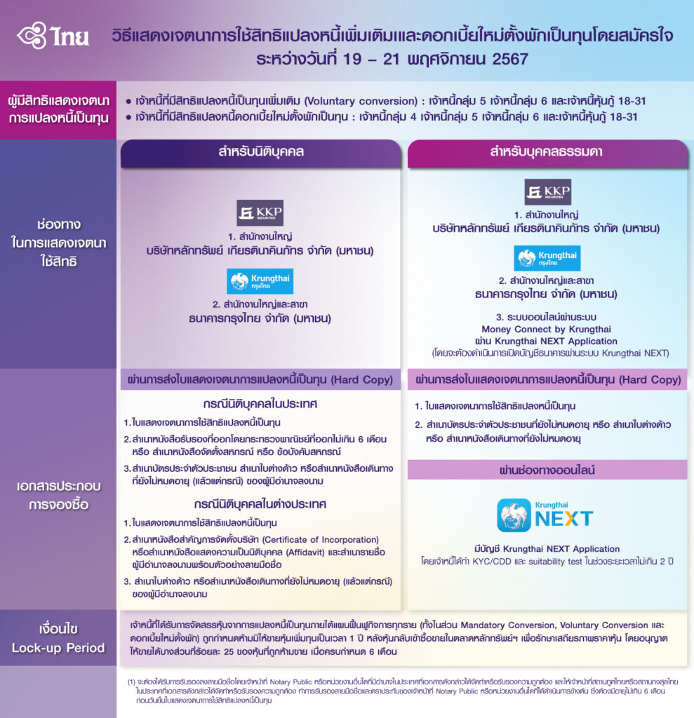 สำหรับเจ้าหนี้ตามแผนฟื้นฟูกิจการที่มีสิทธิแปลงหนี้เป็นทุน ได้แก่ เจ้าหนี้กลุ่มที่ 4 เจ้าหนี้กลุ่มที่ 5 เจ้าหนี้กลุ่มที่ 6 และเจ้าหนี้กลุ่มที่ 18 – 31 ซึ่งเป็นเจ้าหนี้ผู้ถือหุ้นกู้ อ้างอิงรายชื่อ ณ วันที่ 28 ตุลาคม 2567 จะไม่ต้องดำเนินการใด ๆ ในส่วนการแปลงหนี้เป็นทุนแบบภาคบังคับตามข้อ (ก) ข้างต้น โดยจะได้รับการจัดสรรหุ้นสามัญเพิ่มทุนโดยอัตโนมัติ ทั้งนี้ สำหรับการใช้สิทธิแปลงหนี้เดิมตามแผนฟื้นฟูกิจการเป็นทุนเพิ่มเติม (Voluntary Conversion) และ/หรือใช้สิทธิแปลงหนี้ดอกเบี้ยตั้งพักใหม่เป็นทุนตามข้อ (ข) และ (ค) ข้างต้น เจ้าหนี้ตามแผนฟื้นฟูกิจการที่มีสิทธิแปลงหนี้เป็นทุนสามารถแสดงเจตนาการใช้สิทธิดังกล่าว ได้ระหว่าง วันที่ 19 พฤศจิกายน ตั้งแต่เวลา 9.00 น. ถึง วันที่ 21 พฤศจิกายน 2567 เวลา 16.00 น. (หรือเวลาทำการของแต่ละสาขา) ผ่านช่องทางใดช่องทางหนึ่งดังนี้