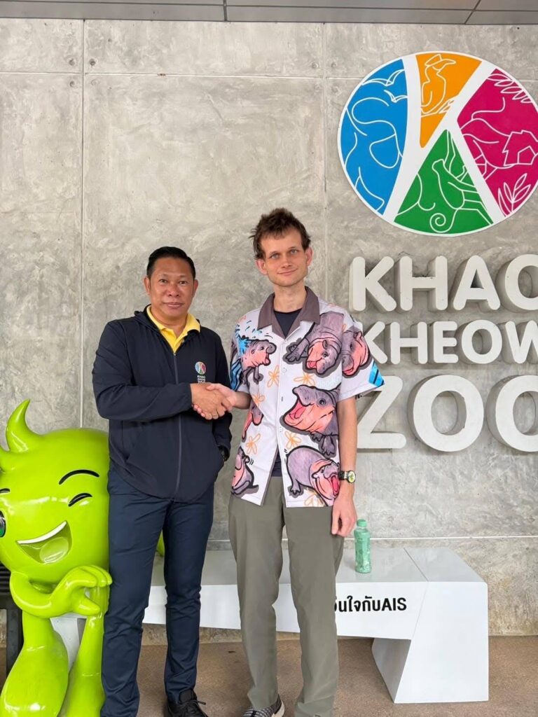 สวนสัตว์เปิดเขาเขียวโพสต์ในสื่อออนไลน์ ว่า Vitalik Buterin ผู้สร้างเหรียญคริปโตฯ Ethereum ประทับใจการบริหารงานสวนสัตว์ เขาเขียว และถือโอกาสแวะมาพบและเยี่ยมชมสวนสัตว์เปิดเขาเขียว และมีภาพ Vitalik Buterin ถือถุงกับข้าวของไทยถ่ายภาพกับน้องเบนซ์ ผู้ดูแลหมูเด้ง ในเพจเฟซบุ๊ก “ขาหมู แอนด์เดอะแก๊ง” พร้อมกับระบุข้อความว่า “Nice to meet you เมนูวันนี้คืออะไร” โดย วิทาลิก ได้ขายเหรียญ MOODENG บนเครือข่าย Ethereum จำนวน 10,000 ล้านโทเคน และมีการนำรายได้บริจาคเพื่อการกุศลเมื่อเดือนตุลาคม 2567 ซึ่งขณะนี้เหรียญหมูเด้งก็ยังมีการซื้อขายอยู่จริงๆ