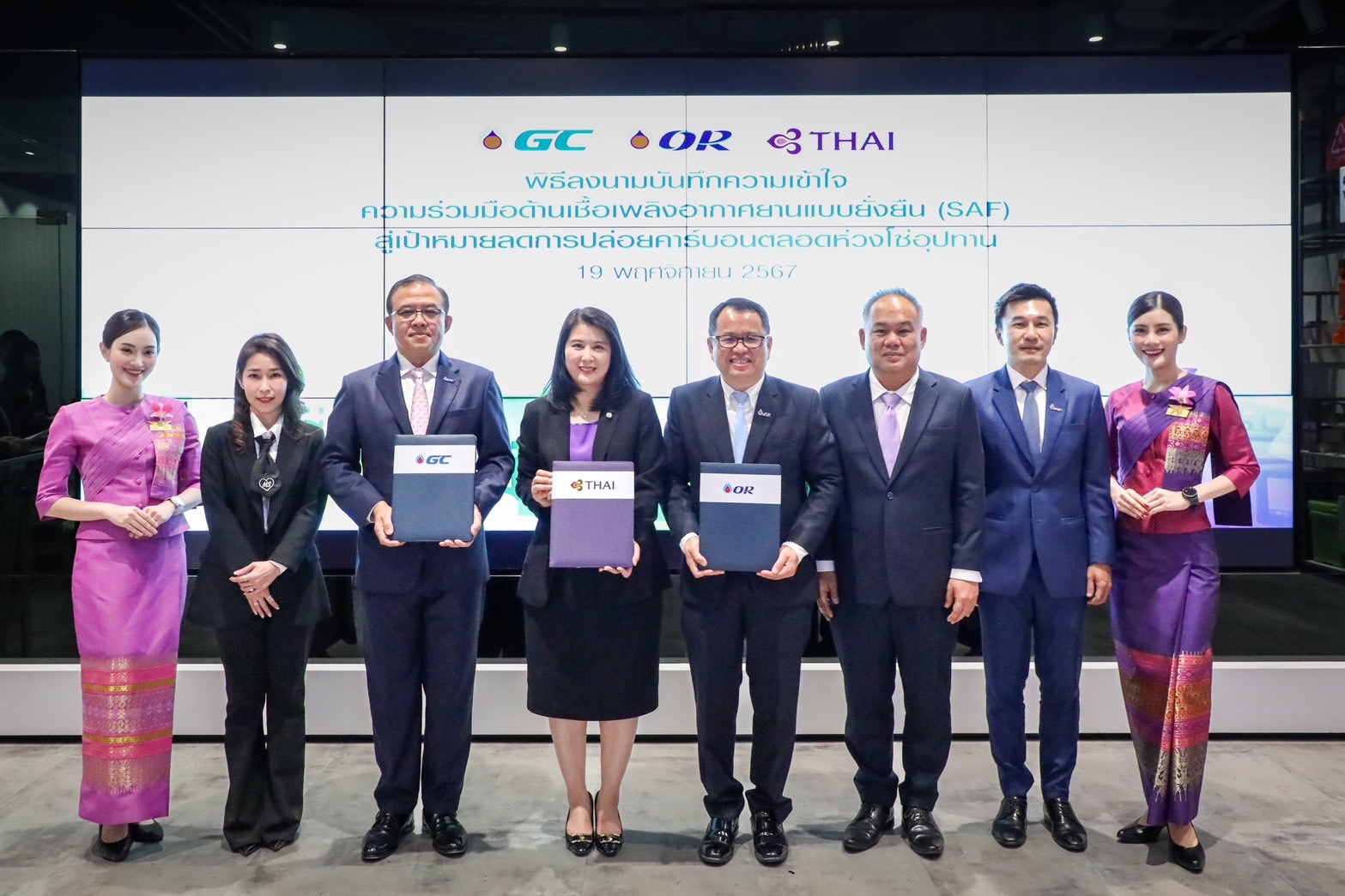 นายสุชาติ ระมาศ ผู้อำนวยการใหญ่บริษัท OR เปิดเผยว่า OR มีความมั่นใจในความสามารถที่จะให้บริการด้านการจำหน่าย การจัดส่ง และรองรับSAF โดย OR และ GC ได้ร่วมพัฒนานวัตกรรมผลิตภัณฑ์และเทคโนโลยีที่ยั่งยืนสำหรับการผสม SAF โดยนำกระบวนการ Co-Processing ของ GC มาใช้ในอุตสาหกรรมการบินเป็นครั้งแรกเพื่อรองรับนโยบายการบังคับใช้ SAF ของประเทศไทย ซึ่งจะทำให้ความต้องการเพิ่มสูงขึ้น ด้วยระบบโลจิสติกส์ที่แข็งแกร่งของ OR มีความพร้อมในการจัดส่ง SAF ไปยังทุกภูมิภาคของประเทศไทย และด้วยความร่วมมือร่วมกับTG เพื่อใช้ SAF ในเที่ยวบินของการบินไทยทั้งเส้นทางบินในประเทศและต่างประเทศ ท