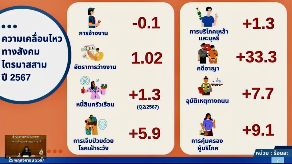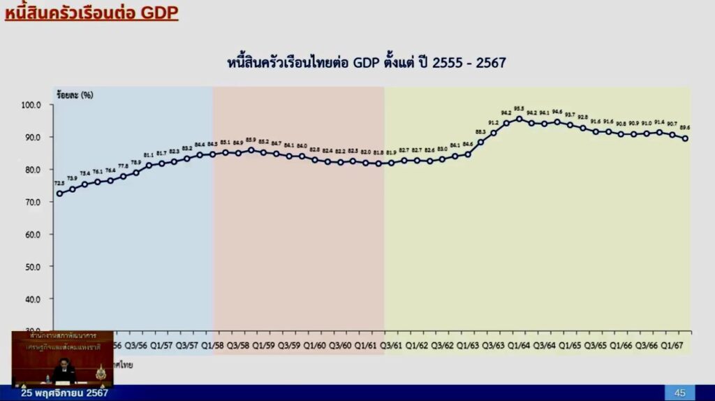 กรุงเทพฯ 25 พ.ย. – สศช.เผยหนี้ครัวเรือนไทยไตรมาส 2/67 อยู่ที่ 89.6% ต่อจีดีพี ต่ำกว่า 90% ในรอบเกือบ 4 ปี แต่สินเชื่อส่วนบุคคลยังสูง หนี้ NPLs-อัตราว่างงานเพิ่มขึ้น ระบุลดเงินเข้า FIDF ต้องไม่กระทบงบประมาณ ชี้ศึกษา NIT เป็นกลไกให้ช่วยเหลือผู้มีรายได้น้อย