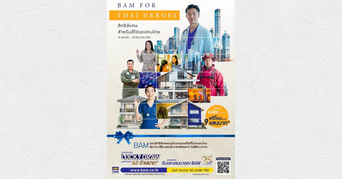 BAM จัดโครงการเพื่อฮีโร่ของคนไทย BAM for Thai Heroes ต่อเนื่องปีที่ 2 พร้อมเพิ่มโอกาสให้กับฮีโร่ที่เกษียณอายุ และครอบครัวของฮีโร่ เพื่อแทนคำขอบคุณบุคลากรทางการแพทย์ ทางการศึกษา ตำรวจ ทหาร อสม.ทั่วประเทศ คัดทรัพย์คุณภาพ ทำเลดี มีให้เลือกทั้งบ้าน ที่ดิน คอนโด และอสังหาฯ เพื่อการลงทุนจำนวนกว่า 4,000 รายการ รวมมูลค่ากว่า 7,000 ล้านบาท ลดราคาสูงสุด 70% ตั้งแต่วันนี้ถึง 30 ธันวาคม 2567 อัดโปรโมชั่นโอนเร็ว รับเลย ฟรีค่าโอนสูงสุด 900,000 บาทต่อรายการ Premium Gift Set สุดพิเศษจาก BAM และรับสิทธิ์ลุ้น Lucky Draw มูลค่ารวมกว่า 6,500,000 บาท