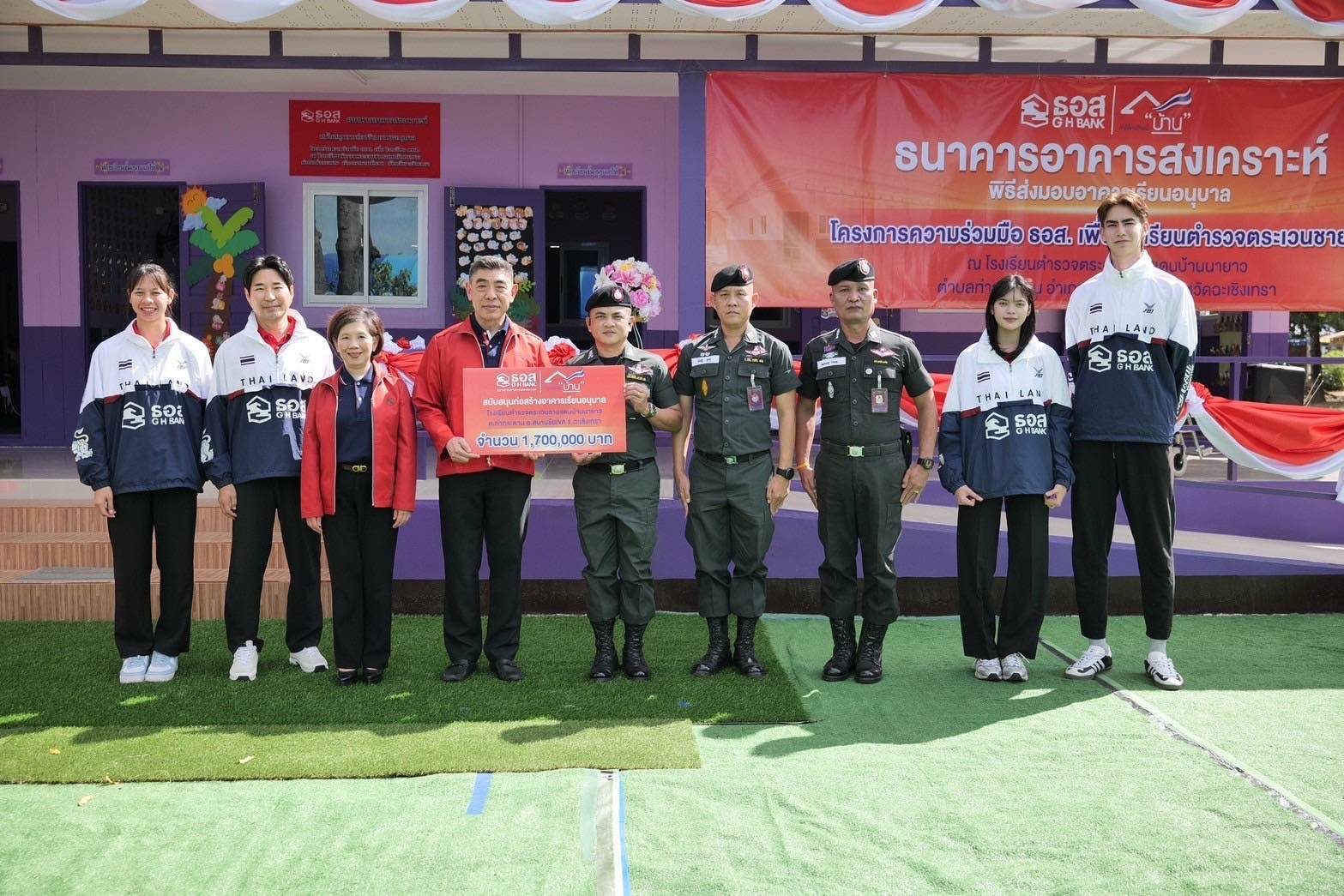 ธนาคารอาคารสงเคราะห์ (ธอส.) สร้างโอกาสและพัฒนาคุณภาพทางการศึกษาให้แก่เด็กและเยาวชนในถิ่นทุรกันดาร ด้วยการส่งมอบอาคารเรียนอนุบาลหลังใหม่ให้แก่โรงเรียนตำรวจตระเวนชายแดนบ้านนายาว ตำบลท่ากระดาน อำเภอสนามชัยเขต จังหวัดฉะเชิงเทรา ภายใต้ “โครงการสร้าง/ซ่อมอาคารเรียนในถิ่นทุรกันดาร” ประจำปี 2567 เพื่อให้เยาวชนได้รับการศึกษาในสภาพที่เหมาะสมกับการเรียนการสอน และส่งมอบบ้านให้แก่นักเรียน ตามโครงการสร้าง/ซ่อมที่อยู่อาศัย เพื่อผู้ด้อยโอกาส ผู้ยากไร้ ผู้สูงอายุ และผู้พิการ