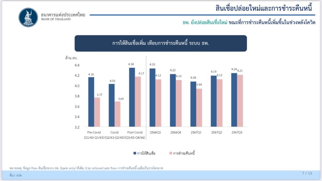 กรุงเทพฯ 26 พ.ย. – ธปท.แย้มได้ข้อสรุปมาตรการแก้หนี้ภายในสิ้นปีนี้ ชี้ลดเงินนำส่งกองทุน FIDF ไม่ซ้ำรอยปี 63 เหตุแบงก์แข็งแกร่ง เผยไตรมาส 3/67 สินเชื่อแบงก์หดตัวที่ 2.0% แต่ NPL เพิ่มเล็กน้อยที่ 2.97%