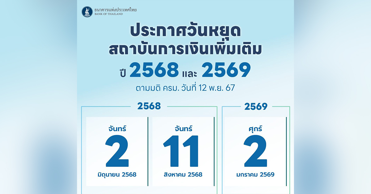 ธนาคารแห่งประเทศไทยพิจารณาแล้ว เห็นสมควรให้เพิ่มวันหยุดทำการของสถาบันการเงินและสถาบันการเงินเฉพาะกิจเป็นกรณีพิเศษ ประจำปี 2568 จำนวน 2 วัน ได้แก่ วันที่ 2 มิถุนายน 2568 และวันที่ 11 สิงหาคม 2568 และประจำปี 2569 จำนวน 1 วัน ได้แก่ วันที่ 2 มกราคม 2569 เพื่อให้สอดคล้องกับนโยบายของรัฐบาล.-516-สำนักข่าวไทย