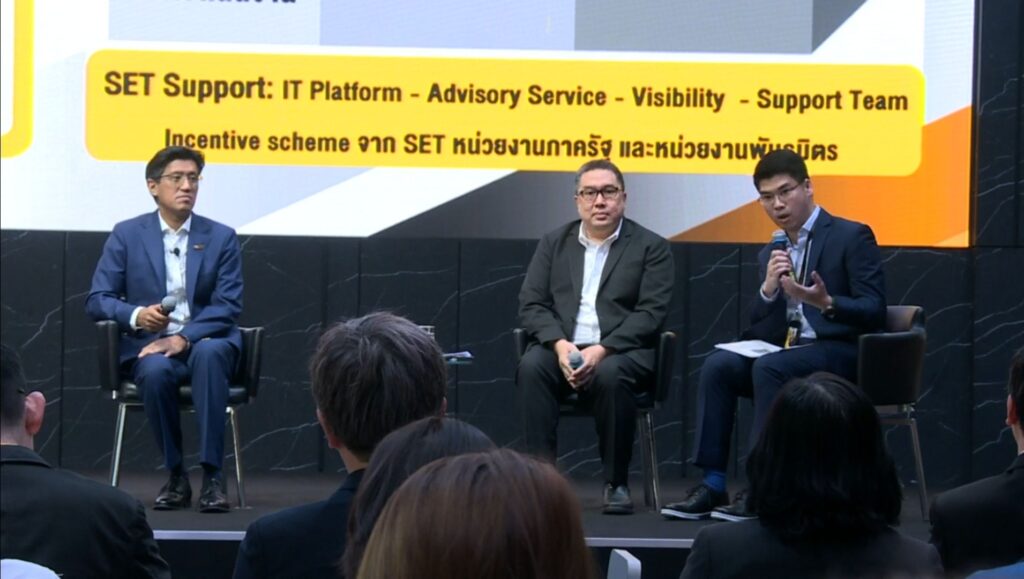 ผู้ประกอบวิชาชีพ ภาคการศึกษา และ Influencer ที่มีความรู้ความเข้าใจด้านการเงิน การลงทุน พร้อมทั้งนำเสนอ SET Learn Scape Platform ซึ่งเป็นแพลตฟอร์มรองรับกระบวนการการเรียนรู้แบบเฉพาะบุคคลเพื่อพัฒนาบุคลากรบริษัทจดทะเบียน ช่วยสร้างศักยภาพพนักงาน เสริมความแข็งแกร่งทางธุรกิจได้อย่างยั่งยืน ทั้ง 2 โครงการจะร่วมมือกับพันธมิตรทั้งภาครัฐและเอกชน เพื่อนำเสนอเนื้อหาความรู้ให้กลุ่มเป้าหมายมีภูมิคุ้นกันด้านการเงินและการลงทุน - สนับสนุนการเปลี่ยนผ่านสู่ low carbon economyร่วมกับพันธมิตร ด้วยการออกแบบรูปแบบ Carbon Market Platform ที่เหมาะสม เพื่อรองรับการซื้อขายคาร์บอนเครดิตทั้งในตลาดภาคบังคับ (Compliance market) และภาคสมัครใจ (Voluntary market)พัฒนาเครื่องมือในการคำนวณ Carbon Footprint ขององค์กร (SET Carbon) พร้อมสนับสนุนการสร้างหลักสูตรและจัดสอบผู้ทวนสอบ (Verifier) เพื่อส่งเสริมการมุ่งสู่ Low Carbon Economy และ Net Zero ในปี 2593